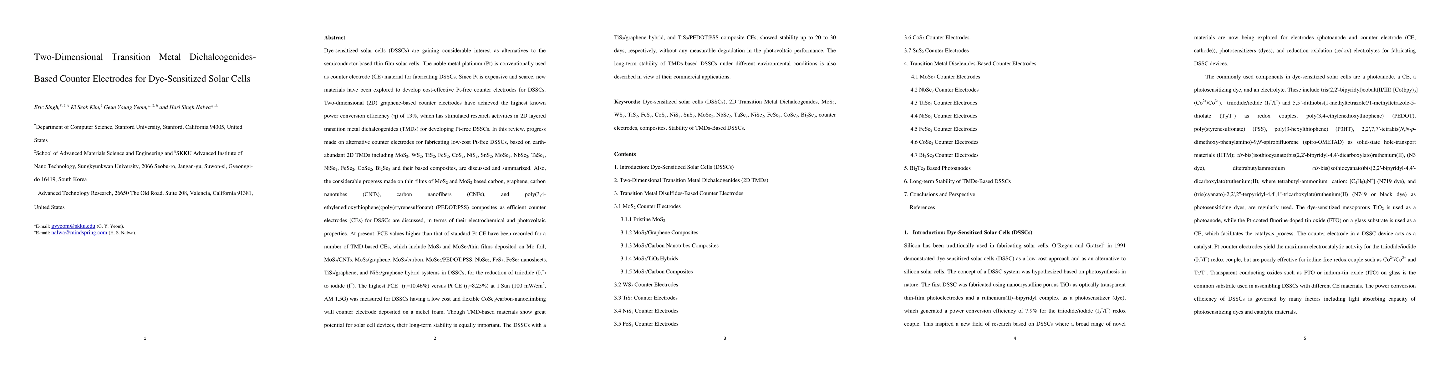 This paper reviews the progress in developing cost-effective, platinum-free counter electrodes for dye-sensitized solar cells (DSSCs) using two-dimensional transition metal dichalcogenides (TMDs) and their composites. Significant advancements in power conversion efficiency (PCE) have been achieved with materials like MoS2, MoSe2, and CoSe2, surpassing the performance of conventional platinum electrodes.