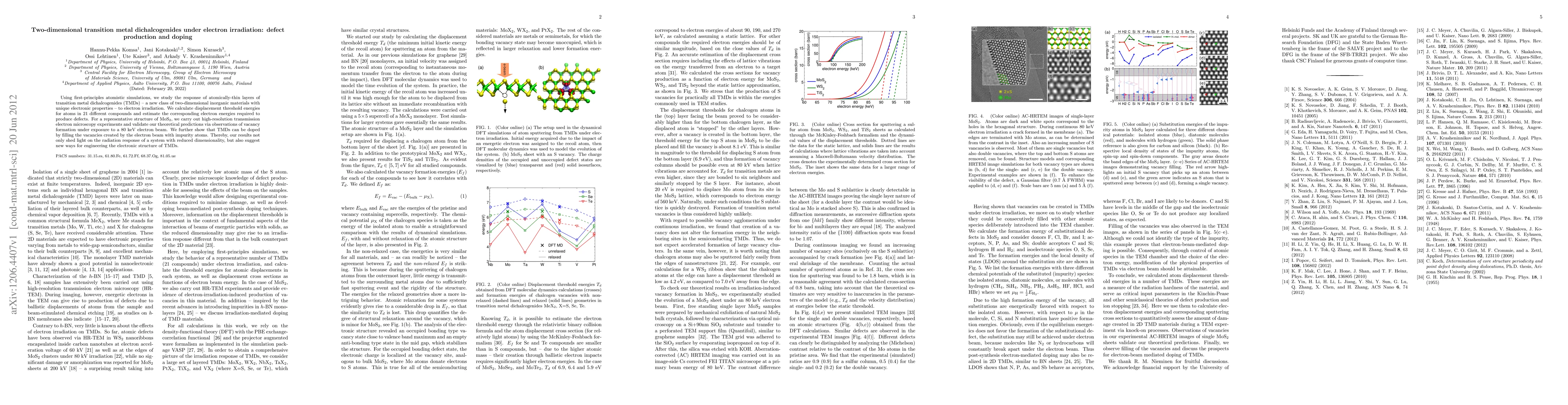 This paper uses first-principles simulations to investigate defect formation in 2D transition metal dichalcogenides (TMDs) under electron irradiation, identifying threshold energies for atomic displacements. Experimental validation via high-resolution microscopy confirms theoretical predictions of vacancy formation in MoS2, and demonstrates the potential for doping TMDs by introducing impurity atoms into created vacancies.
