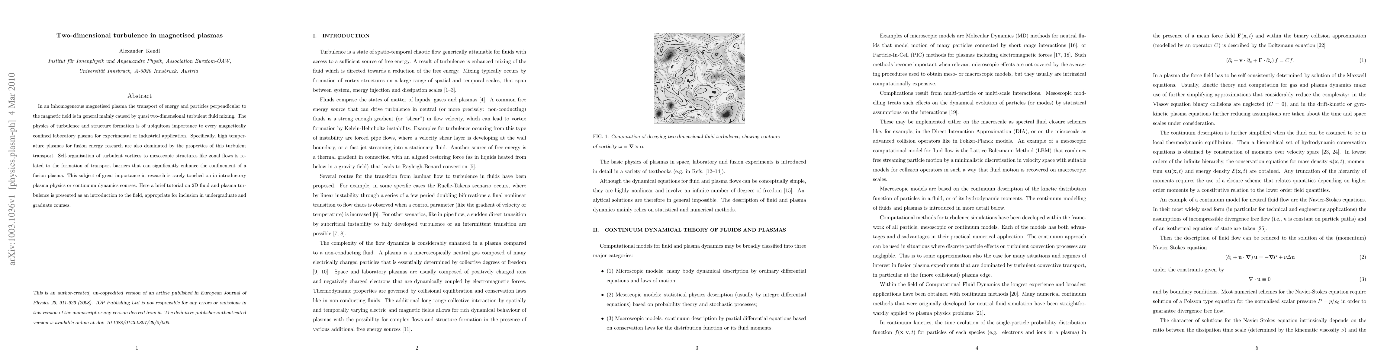 This paper provides an introduction to two-dimensional turbulence in magnetised plasmas, focusing on quasi-two-dimensional turbulent mixing that dominates energy and particle transport perpendicular to magnetic fields. It highlights the significance of self-organised turbulent vortices in forming transport barriers and enhancing fusion plasma confinement.
