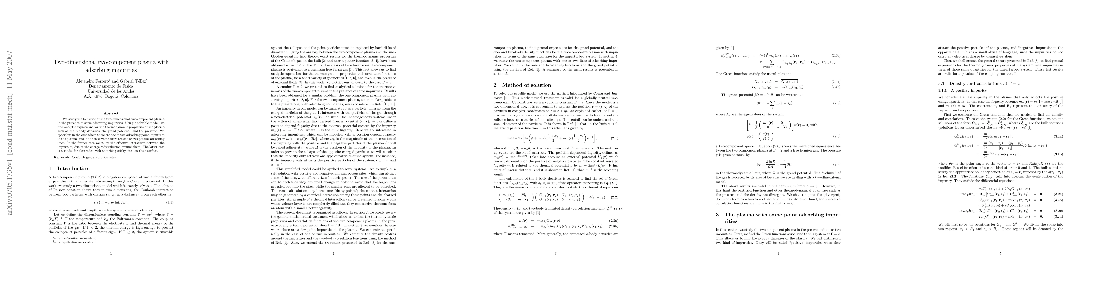This paper investigates a solvable model of a two-dimensional two-component plasma with adsorbing impurities, deriving analytic expressions for thermodynamic properties including $n$-body densities, grand potential, and pressure. It focuses on interactions in systems with one or two point impurities and parallel lines, modeling charge redistribution and sticky electrode surfaces.