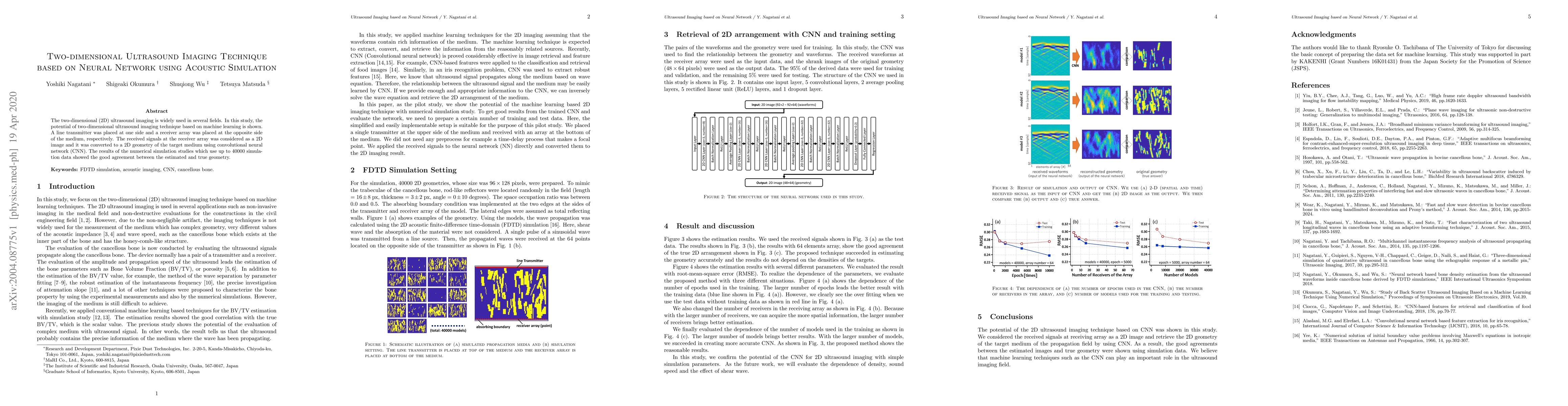 This research explores a novel two-dimensional ultrasound imaging technique leveraging machine learning, specifically convolutional neural networks (CNNs). The study demonstrates the potential of this approach by using acoustic simulation data and achieving good agreement between estimated and true geometries, as shown through numerical simulations involving up to 40,000 data points.