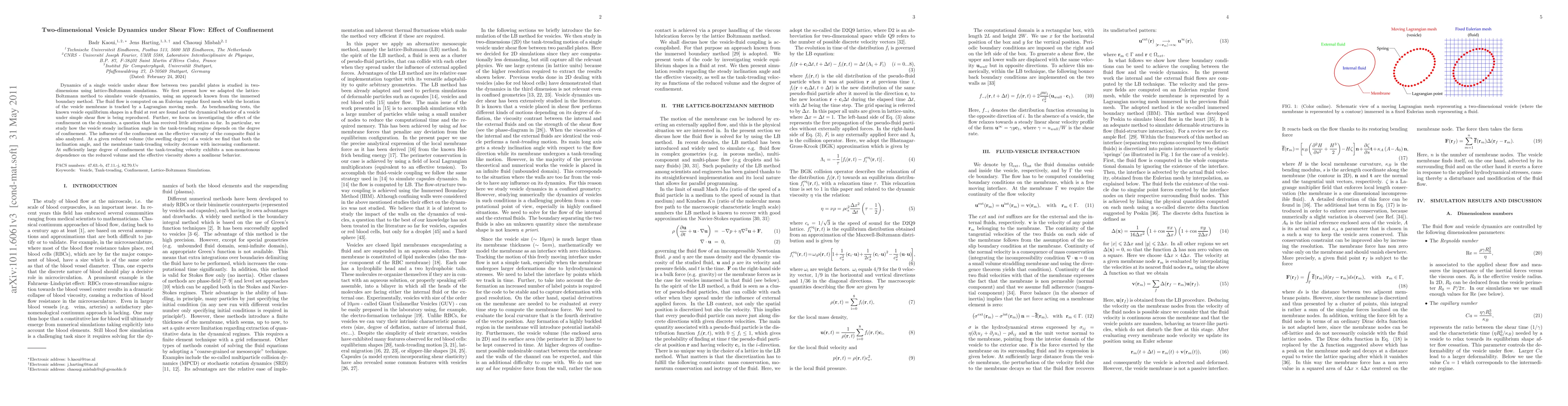 Dynamics of a single vesicle under shear flow between two parallel plates is studied using two-dimensional lattice-Boltzmann simulations. We first present how we adapted the lattice-Boltzmann method to simulate vesicle dynamics, using an approach known from the immersed boundary method. The fluid flow is computed on an Eulerian regular fixed mesh while the location of the vesicle membrane is tracked by a Lagrangian moving mesh. As benchmarking tests, the known vesicle equilibrium shapes in a fluid at rest are found and the dynamical behavior of a vesicle under simple shear flow is being reproduced. Further, we focus on investigating the effect of the confinement on the dynamics, a question that has received little attention so far. In particular, we study how the vesicle steady inclination angle in the tank-treading regime depends on the degree of confinement. The influence of the confinement on the effective viscosity of the composite fluid is also analyzed. At a given reduced volume (the swelling degree) of a vesicle we find that both the inclination angle, and the membrane tank-treading velocity decrease with increasing confinement. At sufficiently large degree of confinement the tank-treading velocity exhibits a non-monotonous dependence on the reduced volume and the effective viscosity shows a nonlinear behavior.