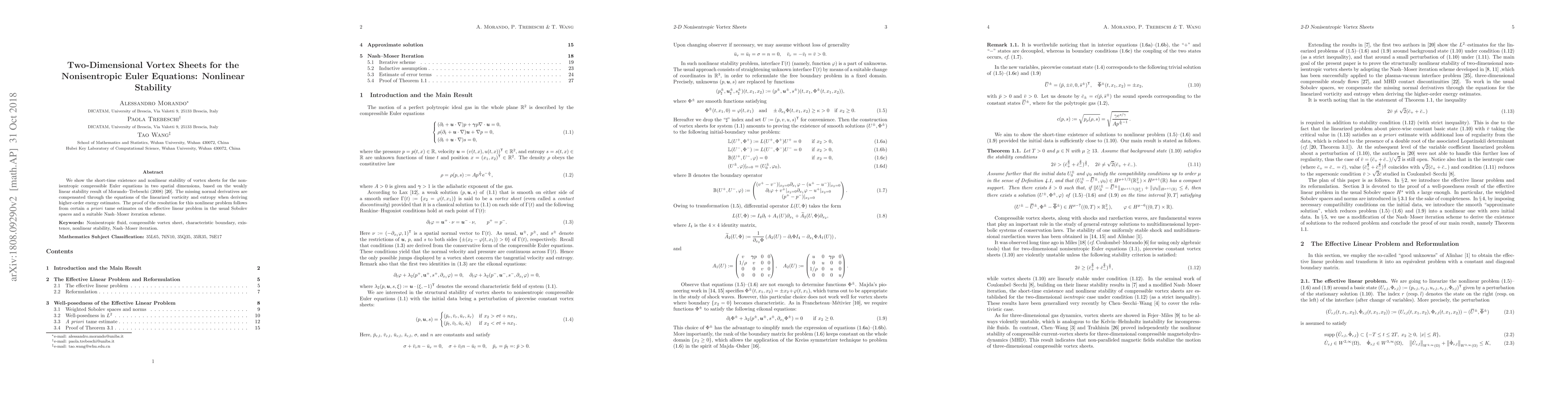 This paper establishes the short-time existence and nonlinear stability of vortex sheets in two-dimensional nonisentropic compressible Euler equations, leveraging weakly linear stability results and higher-order energy estimates. The proof utilizes a priori tame estimates and a Nash-Moser iteration scheme.