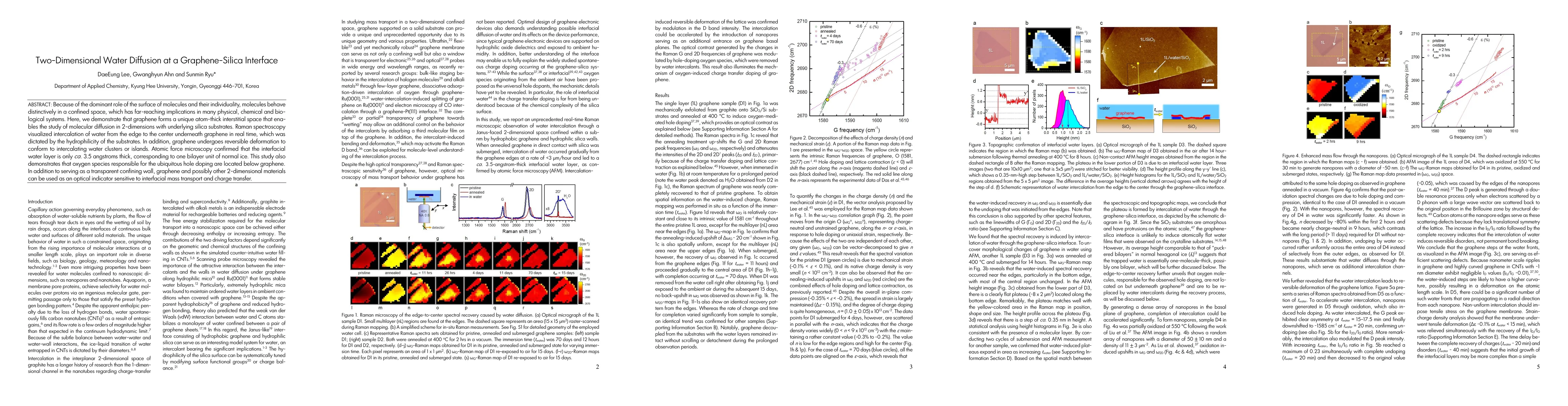 Because of the dominant role of the surface of molecules and their individuality, molecules behave dis-tinctively in a confined space, which has far-reaching implications in many physical, chemical and bio-logical systems. Here, we demonstrate that graphene forms a unique atom-thick interstitial space that enables the study of molecular diffusion in 2-dimensions with underlying silica substrates. Raman spec-troscopy visualized intercalation of water from the edge to the center underneath graphene in real time, which was dictated by the hydrophilicity of the substrates. In addition, graphene undergoes reversible deformation to conform to intercalating water clusters or islands. Atomic force microscopy confirmed that the interfacial water layer is only ca. 3.5 angstroms thick, corresponding to one bilayer unit of normal ice. This study also demonstrates that oxygen species responsible for the ubiquitous hole dop-ing are located below graphene. In addition to serving as a transparent confining wall, graphene and possibly other 2-dimensional materials can be used as an optical indicator sensitive to interfacial mass transport and charge transfer.