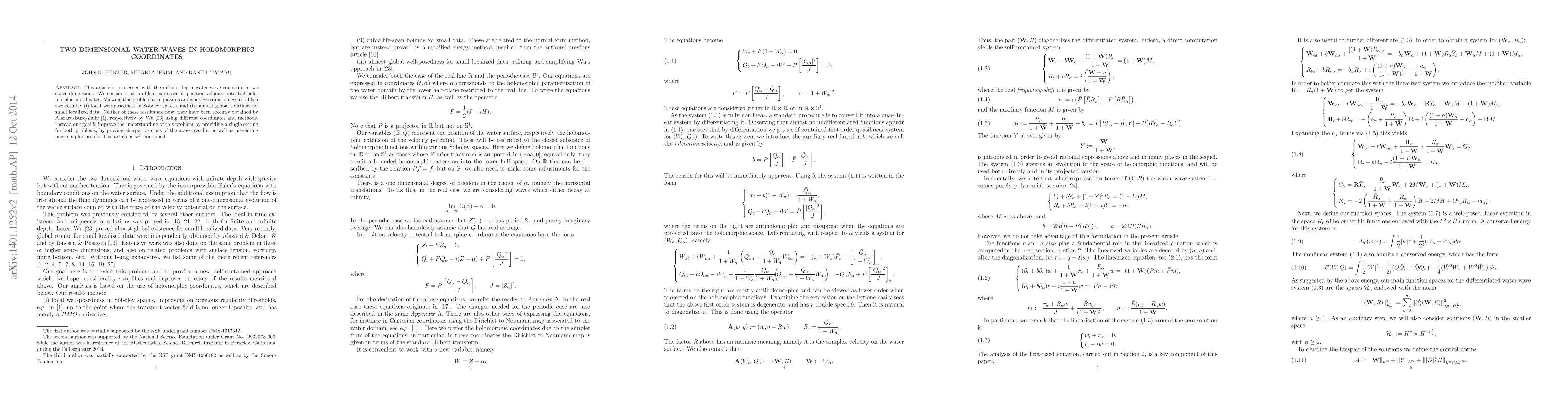 This paper studies the infinite depth water wave equation in two dimensions using holomorphic coordinates, establishing local well-posedness and almost global solutions for small localized data. It aims to provide a unified framework and simpler proofs for these results compared to previous works.