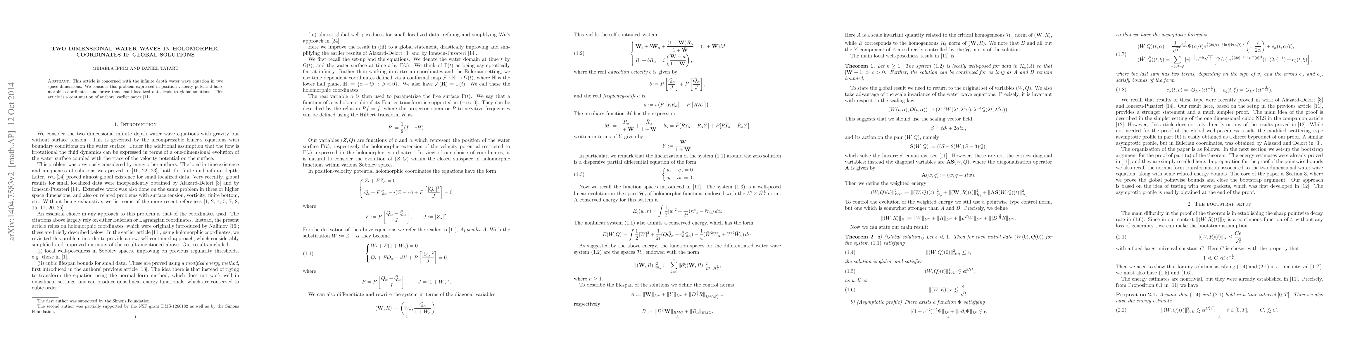 This paper explores the infinite depth water wave equation in two dimensions using holomorphic coordinates, proving that small localized initial data results in global solutions. It builds upon the authors' previous work, extending the analysis to global solutions.
