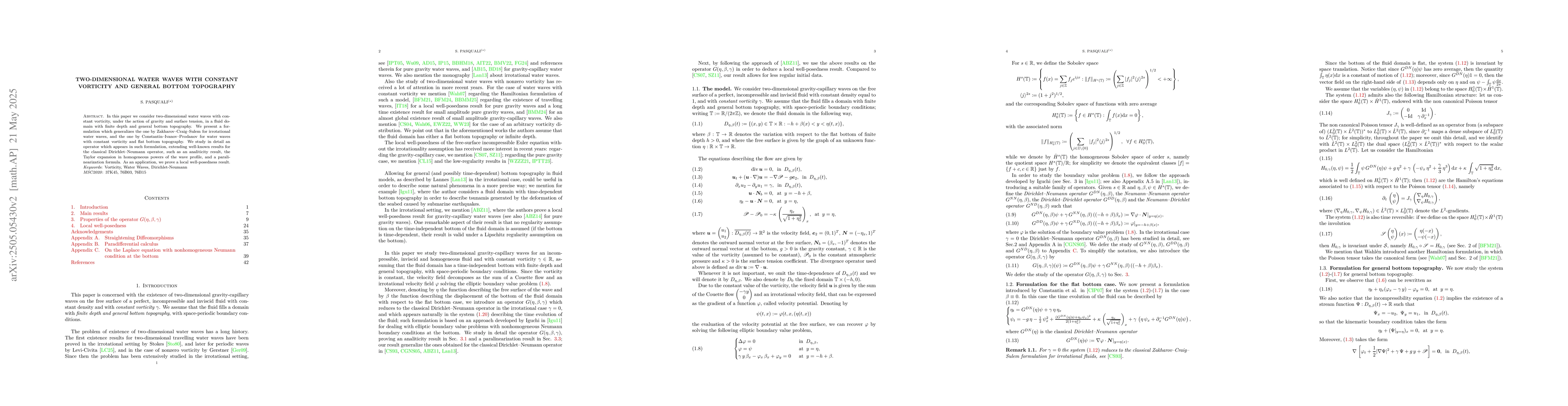 This paper studies two-dimensional water waves with constant vorticity in a fluid domain with general bottom topography, proving local well-posedness results through advanced mathematical analysis.