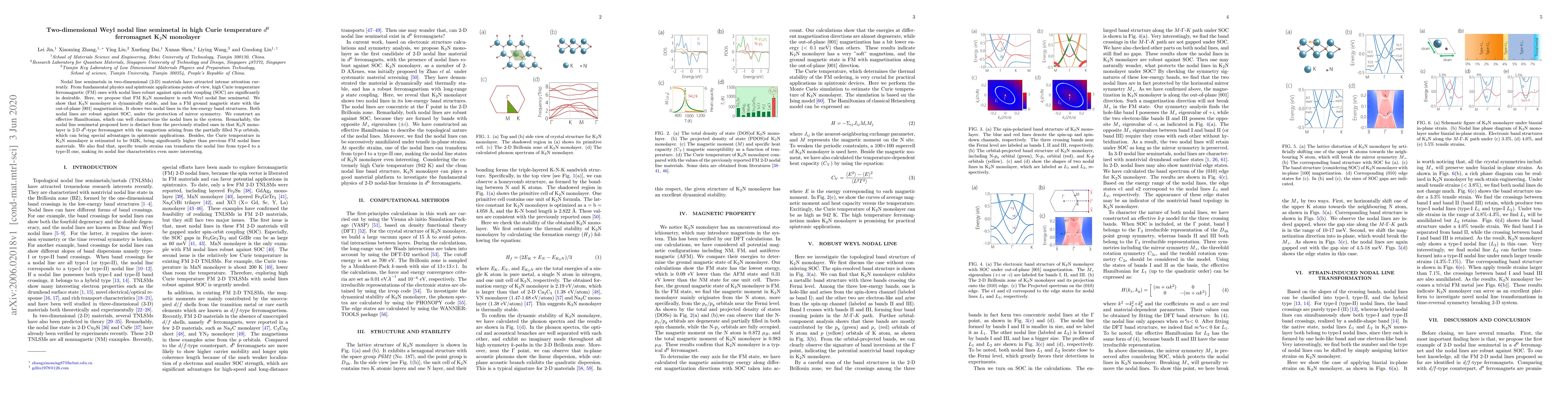 This research proposes a high Curie temperature ferromagnetic Weyl nodal line semimetal in a 2-D K2N monolayer. It features robust nodal lines protected by mirror symmetry and a dynamically stable, out-of-plane magnetic state, with a notably high Curie temperature of 942K and potential for advanced spintronic applications.