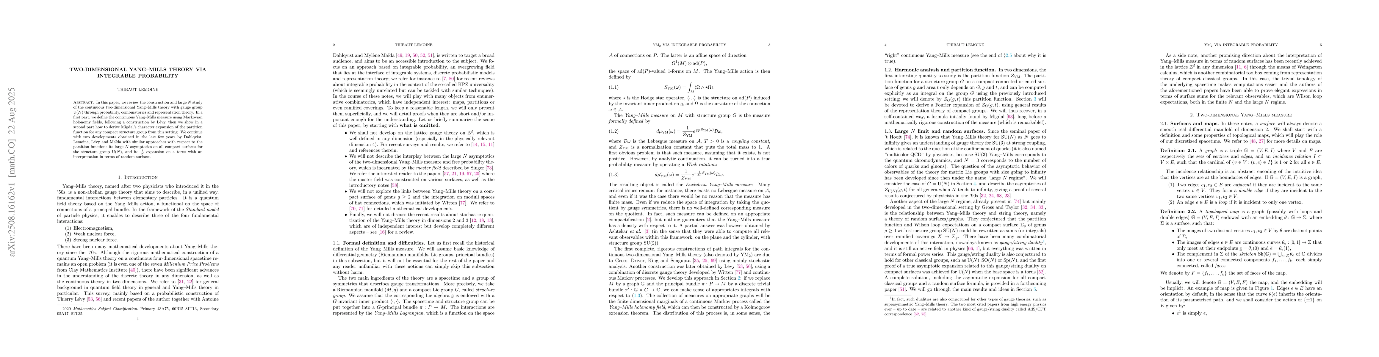 In this paper, we review the construction and large $N$ study of the continuous two-dimensional Yang-Mills theory with gauge group $\mathrm{U}(N)$ through probability, combinatorics and representation theory. In a first part, we define the continuous Yang-Mills measure using Markovian holonomy fields, following a construction by L{\'e}vy, then we show in a second part how to derive Migdal's character expansion of the partition function for any compact structure group from this setting. We continue with two developments obtained in the last few years by Dahlqvist, Lemoine, L{\'e}vy and Ma{\"i}da with similar approaches with respect to the partition function: its large $N$ asymptotics on all compact surfaces for the structure group $\mathrm{U}(N)$, and its $\frac{1}{N}$ expansion on a torus with an interpretation in terms of random surfaces.