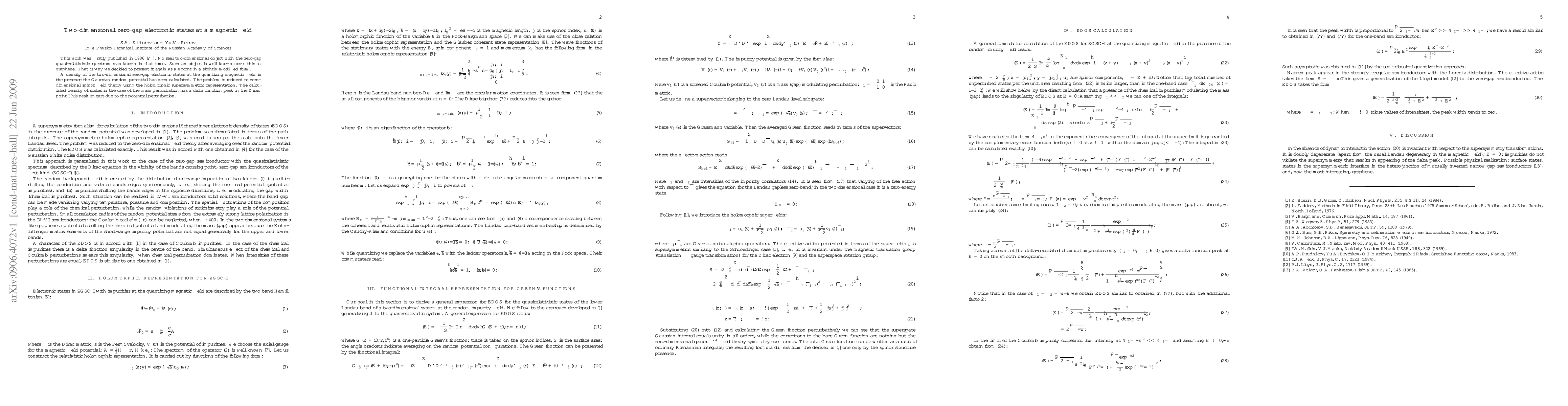 This work was firstly published in 1986 \cite{we}. No real two-dimensional object with the zero-gap quasi-relativistic spectrum was known in that time. Such an object is well known now: this is graphene. That is why we decided to present it again as a e-print in a slightly modified form. A density of the two-dimensional zero-gap electronic states at the quantizing magnetic field in the presence the Gaussian random potential has been calculated. The problem is reduced to zero-dimensional spinor field theory using the holomorphic supersymmetric representation. The calculated density of states in the case of the mass perturbation has a delta function peak in the Dirac point.This peak smears due to the potential perturbation.