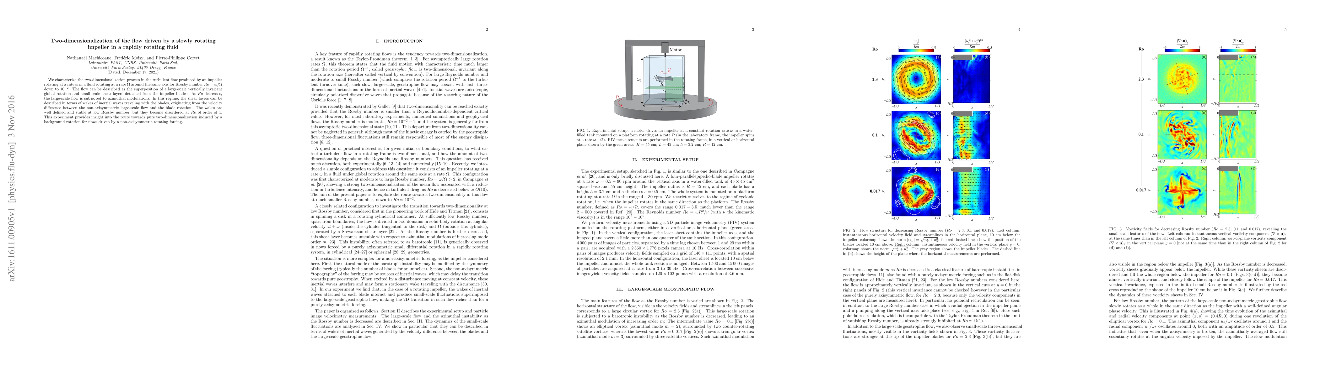 We characterize the two-dimensionalization process in the turbulent flow produced by an impeller rotating at a rate $\omega$ in a fluid rotating at a rate $\Omega$ around the same axis for Rossby number $Ro=\omega/\Omega$ down to $10^{-2}$. The flow can be described as the superposition of a large-scale vertically invariant global rotation and small-scale shear layers detached from the impeller blades. As $Ro$ decreases, the large-scale flow is subjected to azimuthal modulations. In this regime, the shear layers can be described in terms of wakes of inertial waves traveling with the blades, originating from the velocity difference between the non-axisymmetric large-scale flow and the blade rotation. The wakes are well defined and stable at low Rossby number, but they become disordered at $Ro$ of order of 1. This experiment provides insight into the route towards pure two-dimensionalization induced by a background rotation for flows driven by a non-axisymmetric rotating forcing.