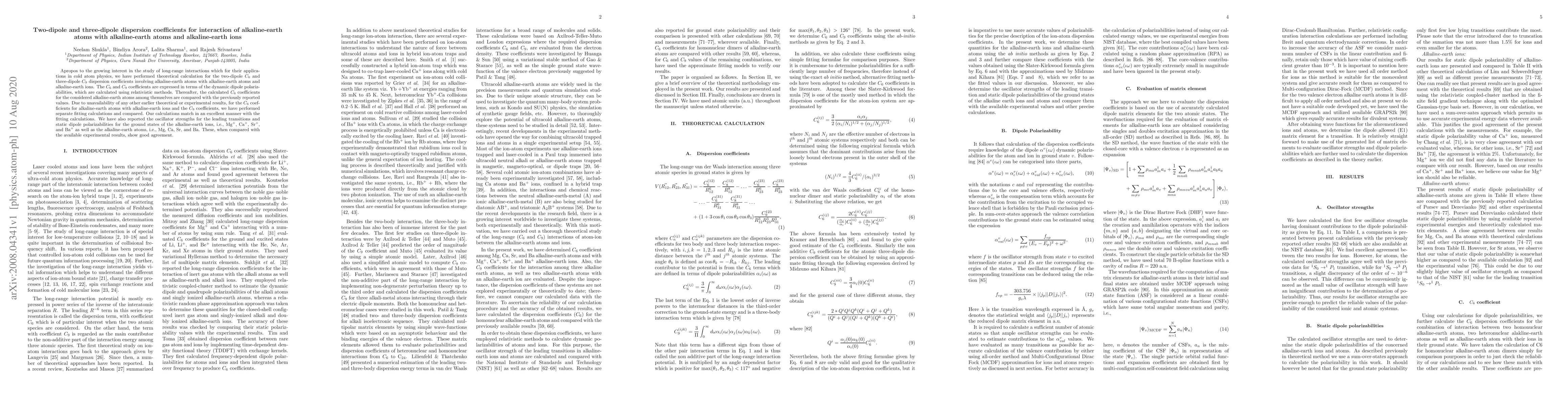 Apropos to the growing interest in the study of long-range interactions which for their applications in cold atom physics, we have performed theoretical calculation for the two-dipole $C_6$ and three-dipole $C_9$ dispersion coefficients involving alkaline-earth atoms with alkaline-earth atoms and alkaline-earth ions. The $C_6$ and $C_9$ coefficients are expressed in terms of the dynamic dipole polarizabilities, which are calculated using relativistic methods. Thereafter, the calculated $C_6$ coefficients for the considered alkaline-earth atoms among themselves are compared with the previously reported values. Due to unavailability of any other earlier theoretical or experimental results, for the $C_6$ coefficients for alkaline-earth atoms with alkaline-earth ions and the $C_9$ coefficients, we have performed separate fitting calculations and compared. Our calculations match in an excellent manner with the fitting calculations. We have also reported the oscillator strengths for the leading transitions and static dipole polarizabilities for the ground states of the alkaline-earth ions, i.e., Mg$^+$, Ca$^+$, Sr$^+$, and Ba$^+$ as well as the alkaline-earth atoms, i.e., Mg, Ca, Sr, and Ba. These, when compared with the available experimental results, show good agreement.