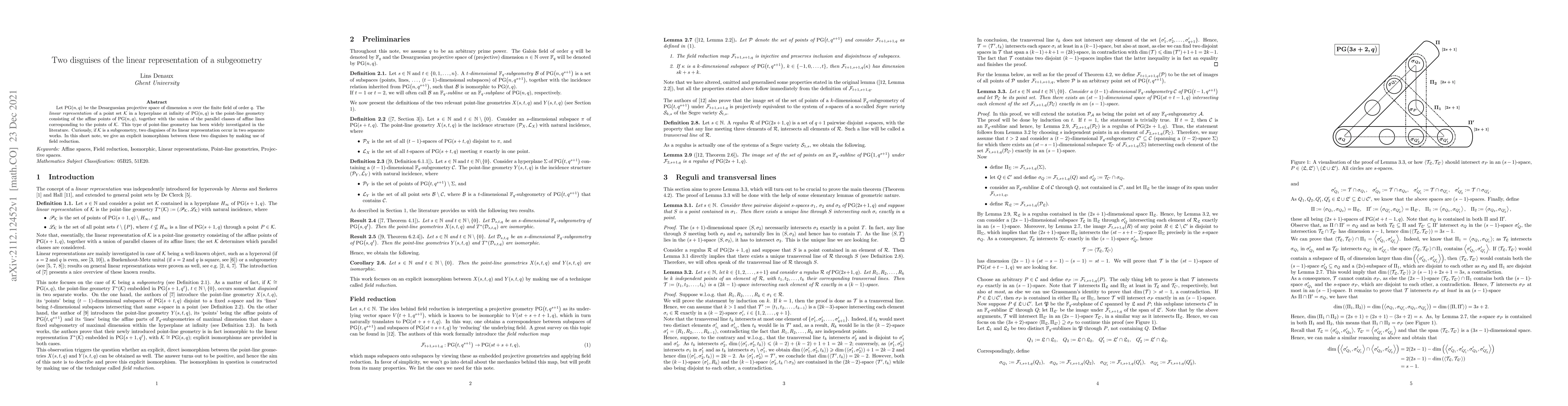 Let $\text{PG}(n,q)$ be the Desarguesian projective space of dimension $n$ over the finite field of order $q$. The \emph{linear representation} of a point set $\mathcal{K}$ in a hyperplane at infinity of $\text{PG}(n,q)$ is the point-line geometry consisting of the affine points of $\text{PG}(n,q)$, together with the union of the parallel classes of affine lines corresponding to the points of $\mathcal{K}$. This type of point-line geometry has been widely investigated in the literature. Curiously, if $\mathcal{K}$ is a subgeometry, two disguises of its linear representation occur in two separate works. In this short note, we give an explicit isomorphism between these two disguises by making use of field reduction.