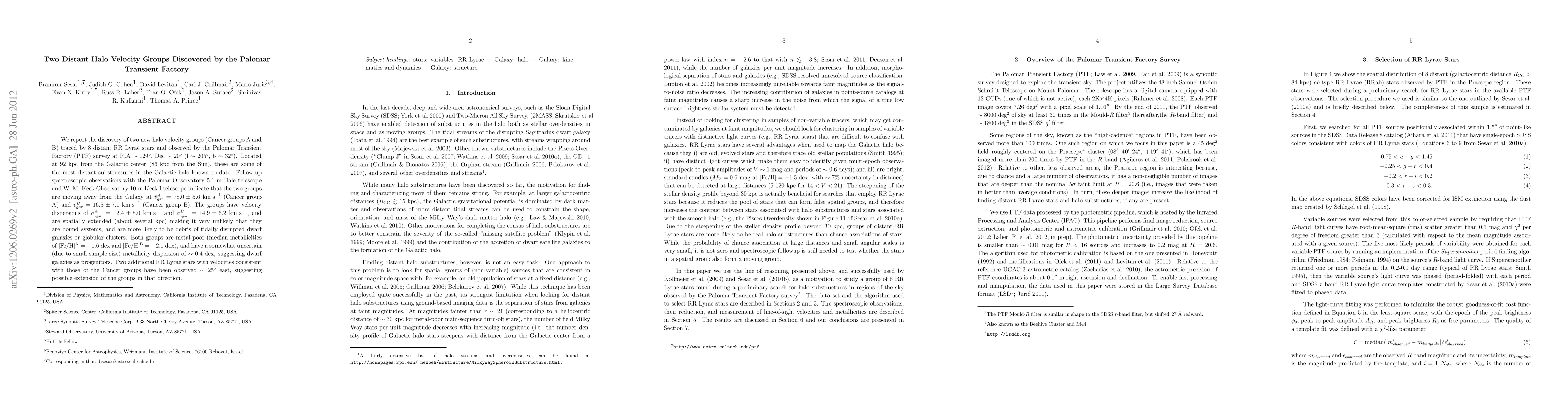 We report the discovery of two new halo velocity groups (Cancer groups A and B) traced by 8 distant RR Lyrae stars and observed by the Palomar Transient Factory (PTF) survey at R.A.~129 deg, Dec~20 deg (l~205 deg, b~32 deg). Located at 92 kpc from the Galactic center (86 kpc from the Sun), these are some of the most distant substructures in the Galactic halo known to date. Follow-up spectroscopic observations with the Palomar Observatory 5.1-m Hale telescope and W. M. Keck Observatory 10-m Keck I telescope indicate that the two groups are moving away from the Galaxy at v_{gsr} = 78.0+-5.6 km/s (Cancer group A) and v_{gsr} = 16.3+-7.1 km/s (Cancer group B). The groups have velocity dispersions of \sigma_{v_{gsr}}=12.4+-5.0 km/s and \sigma_{v_{gsr}}=14.9+-6.2 km/s, and are spatially extended (about several kpc) making it very unlikely that they are bound systems, and are more likely to be debris of tidally disrupted dwarf galaxies or globular clusters. Both groups are metal-poor (median metallicities of [Fe/H] = -1.6 dex and [Fe/H] =-2.1 dex), and have a somewhat uncertain (due to small sample size) metallicity dispersion of ~0.4 dex, suggesting dwarf galaxies as progenitors. Two additional RR Lyrae stars with velocities consistent with those of the Cancer groups have been observed ~25 deg east, suggesting possible extension of the groups in that direction.