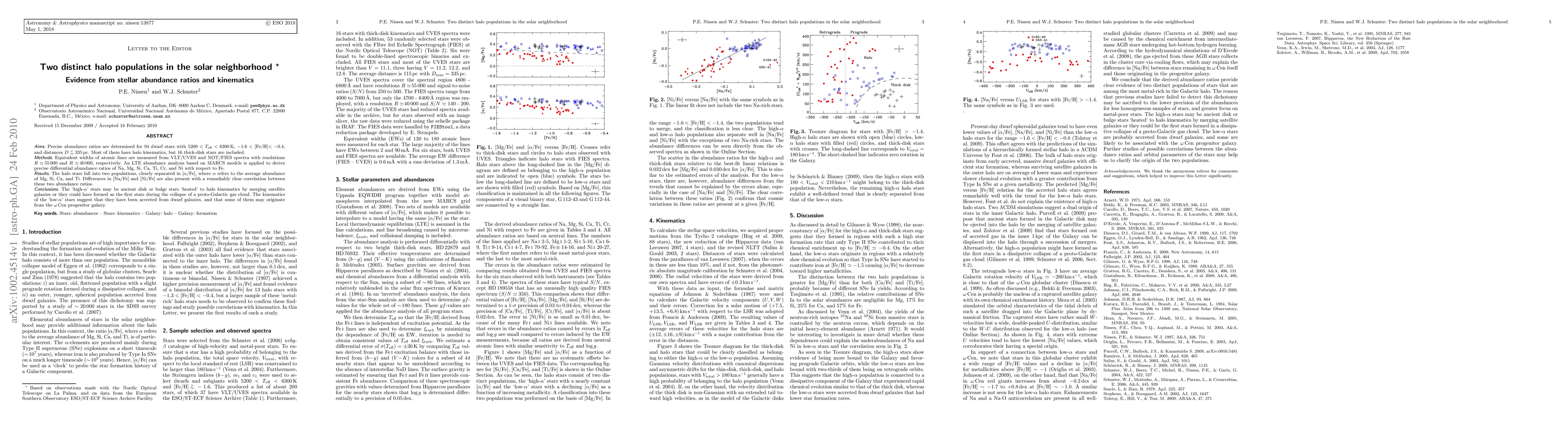 This study identifies two distinct halo populations in the solar neighborhood based on precise stellar abundance ratios and kinematics of 94 dwarf stars. The high-alpha stars show evidence of ancient disk or bulge origins, while low-alpha stars likely originated from accreted dwarf galaxies, possibly including remnants of the omega Cen progenitor galaxy.