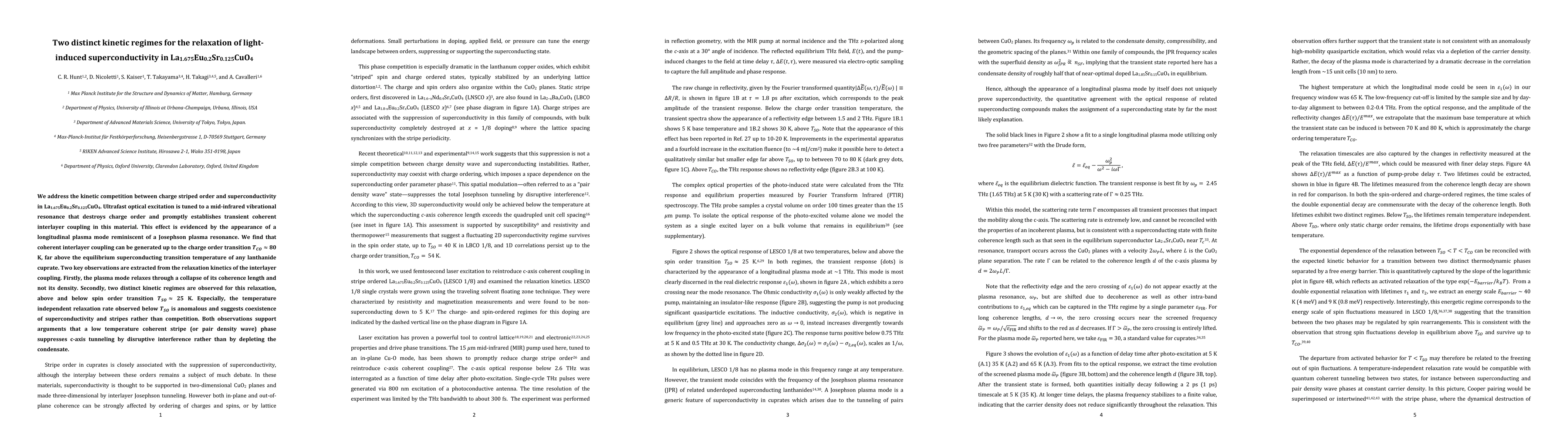 This paper investigates the relaxation kinetics of light-induced superconductivity in La$_{1.675}$Eu$_{0.2}$Sr$_{0.125}$CuO$_{4}$, revealing two distinct kinetic regimes for the relaxation of interlayer coupling. The study finds that the relaxation occurs via coherence length collapse and suggests that superconductivity and charge stripes coexist rather than compete, with a temperature-independent relaxation rate below the spin order transition temperature.