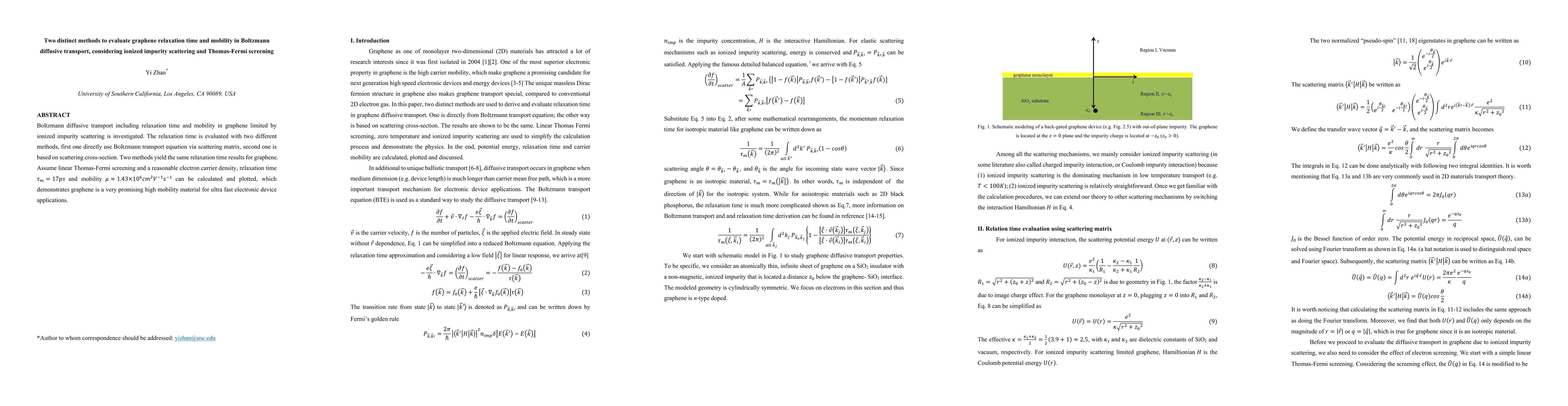 This paper evaluates graphene's relaxation time and mobility in Boltzmann diffusive transport, considering ionized impurity scattering and Thomas-Fermi screening. Two distinct methods yield consistent results, demonstrating graphene's potential for high-speed electronic devices.