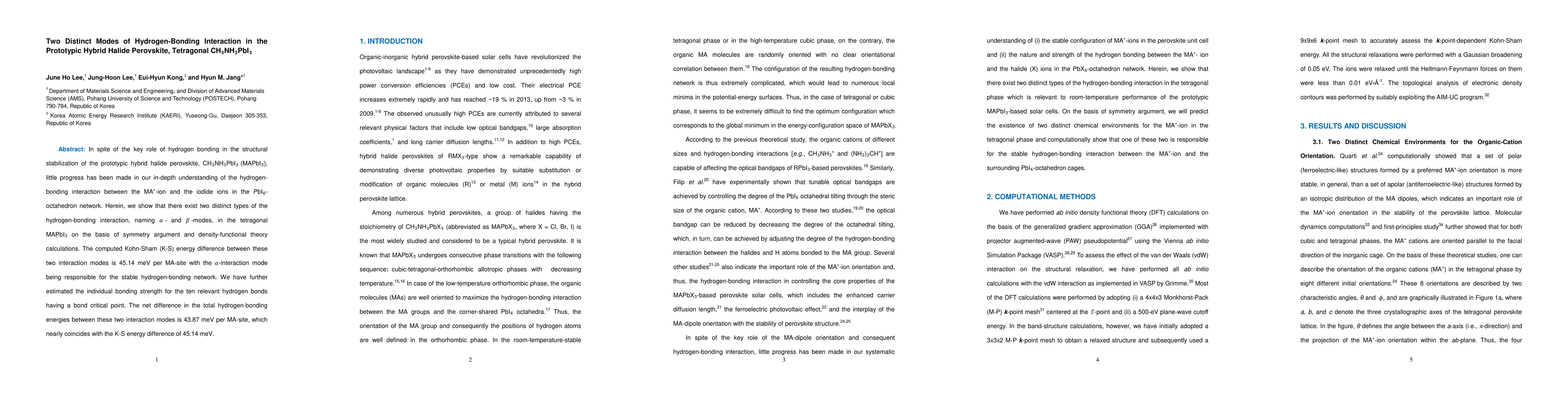 This paper identifies two distinct hydrogen-bonding interaction modes, termed a- and b-modes, in tetragonal CH3NH3PbI3 perovskite, revealing the a-mode as the more stable configuration. Density-functional theory calculations show a 45.14 meV energy difference favoring the a-mode, with a net hydrogen-bonding energy difference of 43.87 meV per MA-site.
