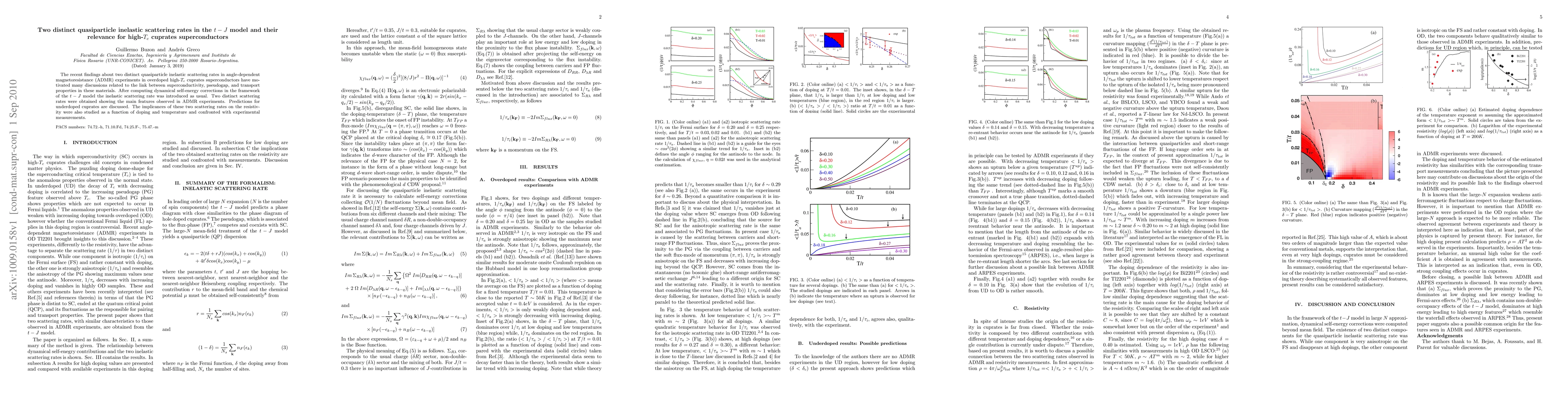 This paper investigates two distinct quasiparticle inelastic scattering rates in the $t-J$ model, revealing their relevance for high-$T_c$ cuprate superconductors. The findings align with angle-dependent magnetoresistance experiments and suggest implications for pseudogap and transport properties, with predictions for underdoped cuprates and resistivity behavior.