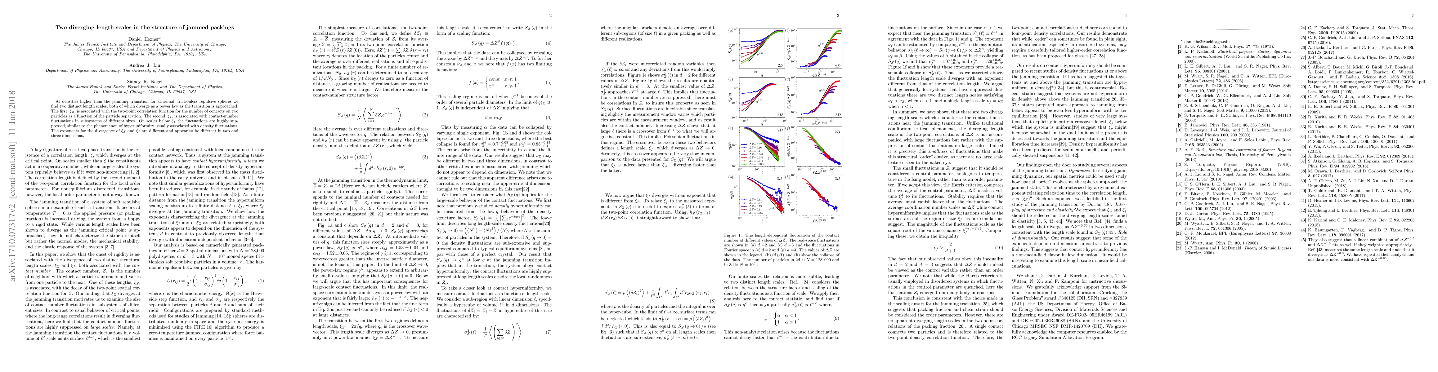At densities higher than the jamming transition for athermal, frictionless repulsive spheres we find two distinct length scales, both of which diverge as a power law as the transition is approached. The first, $\xi_{Z}$, is associated with the two-point correlation function for the number of contacts on two particles as a function of the particle separation. The second, $\xi_{f}$, is associated with contact-number fluctuations in subsystems of different sizes. On scales below $\xi_{f}$ the fluctuations are highly suppressed, similar to the phenomenon of hyperuniformity usually associated with density fluctuations. The exponents for the divergence of $\xi_{Z}$ and $\xi_{f}$ are different and appear to be different in two and three dimensions.