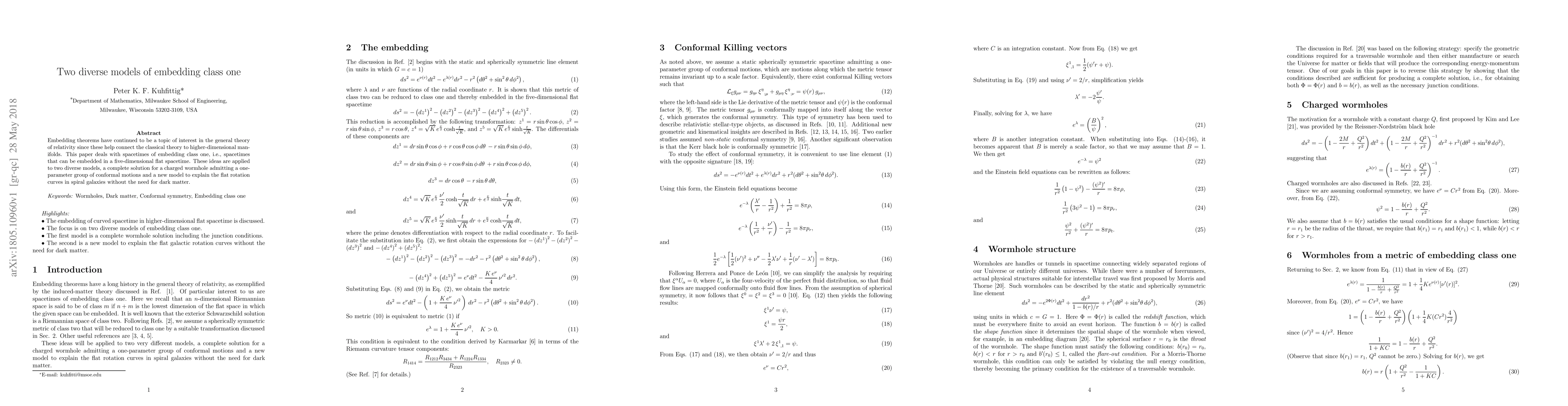 This paper explores two diverse models of embedding class one spacetimes, which can be embedded in a five-dimensional flat spacetime, offering alternative explanations for wormholes and flat rotation curves.