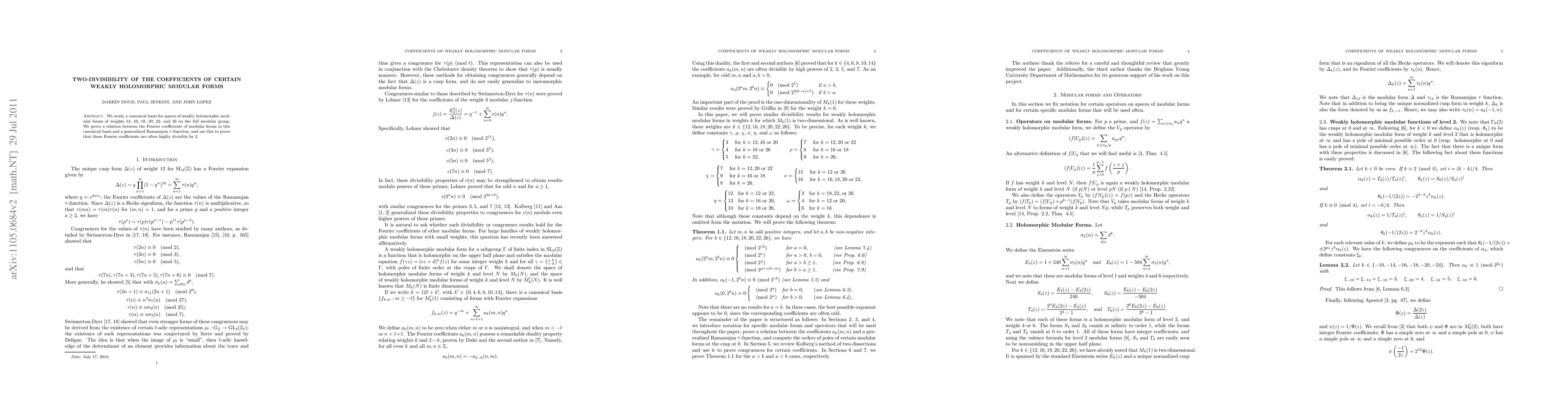 Summary: This paper investigates a canonical basis for weakly holomorphic modular forms of specific weights, establishing a connection between their Fourier coefficients and a generalized Ramanujan tau-function, thereby proving that these coefficients are frequently divisible by 2.