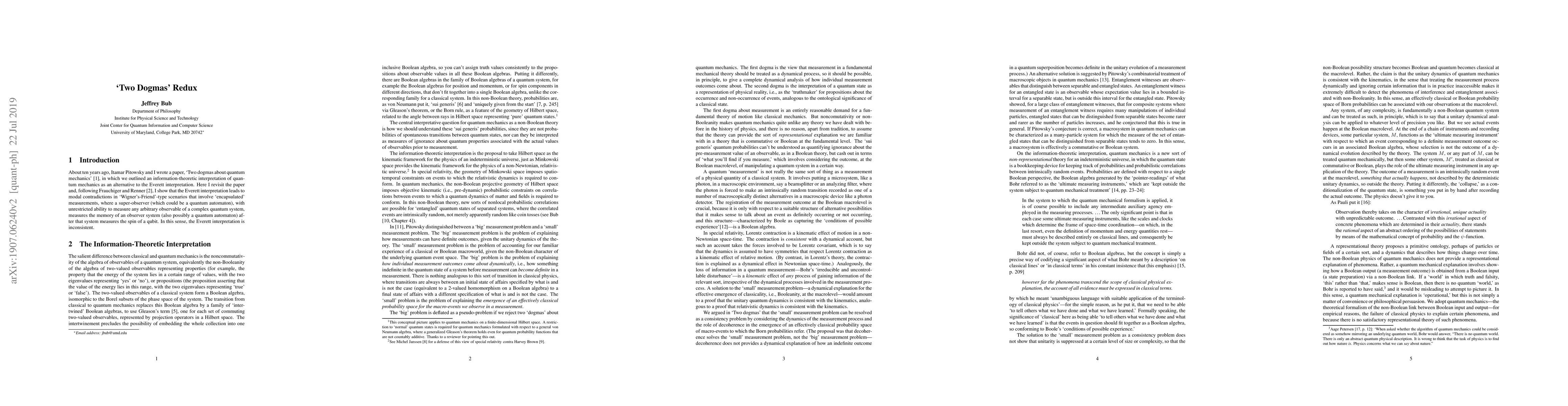 About ten years ago, Itamar Pitowsky and I wrote a paper, 'Two dogmas about quantum mechanics,' in which we outlined an information-theoretic interpretation of quantum mechanics as an alternative to the Everett interpretation. Here I revisit the paper and, following Frauchiger and Renner, I show that the Everett interpretation leads to modal contradictions in 'Wigner's-Friend'-type scenarios that involve 'encapsulated' measurements, where a super-observer (which could be a quantum automaton), with unrestricted ability to measure any arbitrary observable of a complex quantum system, measures the memory of an observer system (also possibly a quantum automaton) after that system measures the spin of a qubit. In this sense, the Everett interpretation is inconsistent.