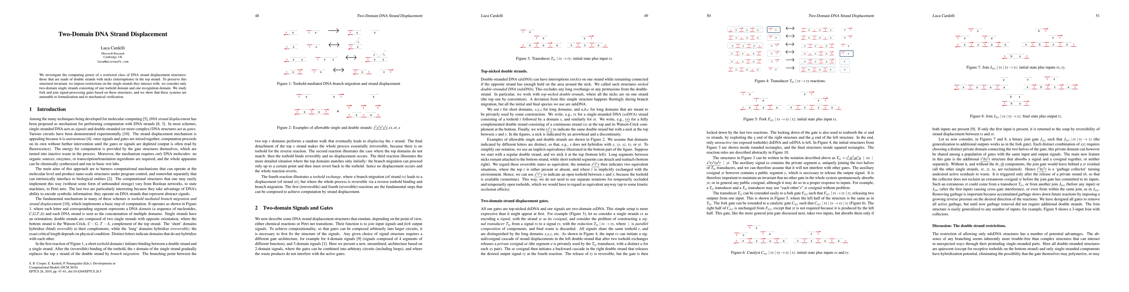 We investigate the computing power of a restricted class of DNA strand displacement structures: those that are made of double strands with nicks (interruptions) in the top strand. To preserve this structural invariant, we impose restrictions on the single strands they interact with: we consider only two-domain single strands consisting of one toehold domain and one recognition domain. We study fork and join signal-processing gates based on these structures, and we show that these systems are amenable to formalization and to mechanical verification.