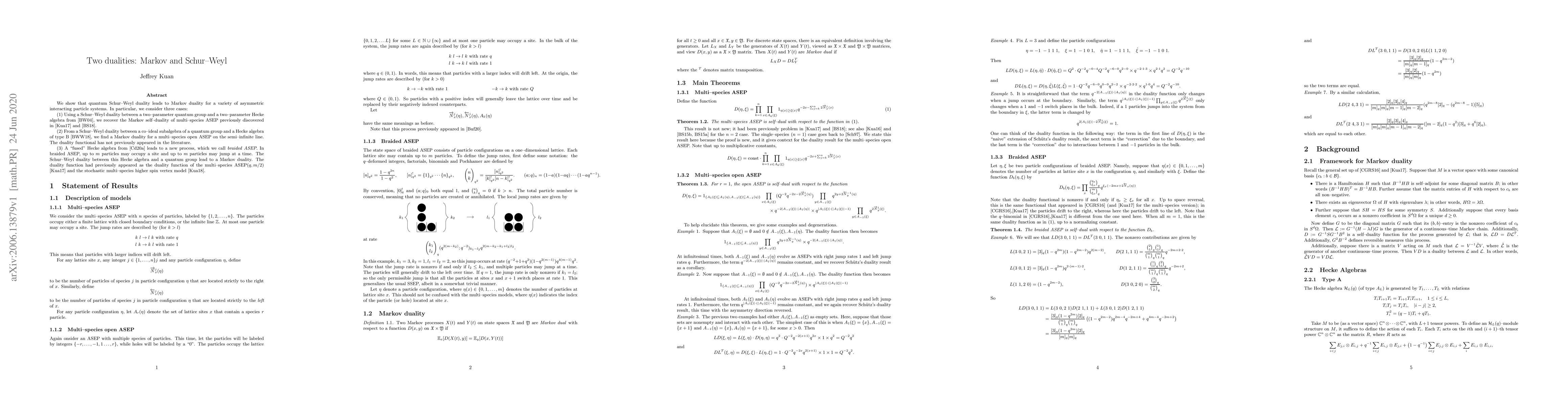 Researchers establish a connection between quantum Schur-Weyl duality and Markov duality in various asymmetric interacting particle systems, including multi-species ASEP.