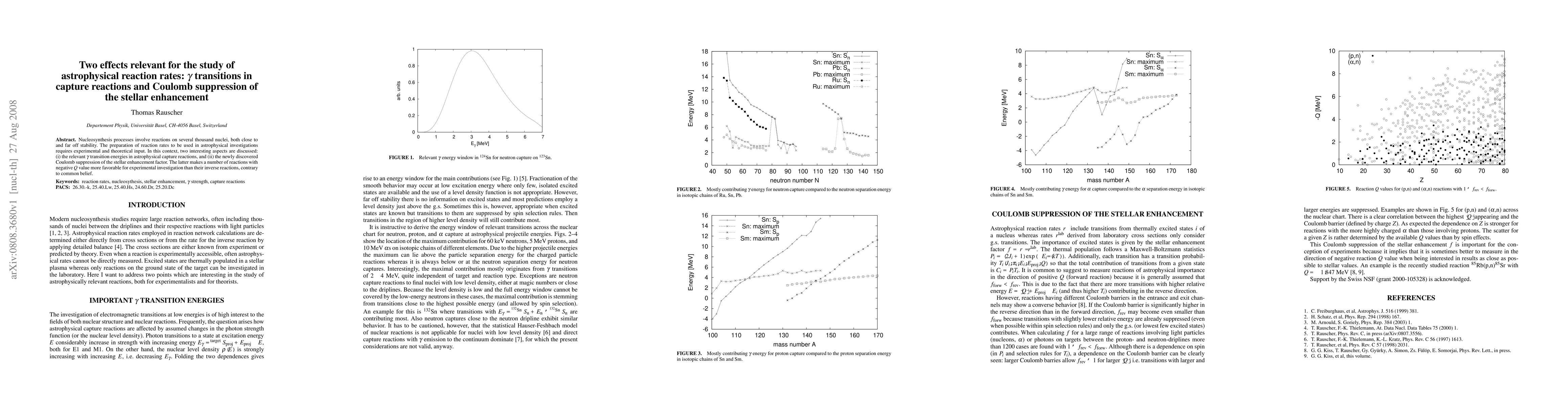 Nucleosynthesis processes involve reactions on several thousand nuclei, both close to and far off stability. The preparation of reaction rates to be used in astrophysical investigations requires experimental and theoretical input. In this context, two interesting aspects are discussed: (i) the relevant gamma transition energies in astrophysical capture reactions, and (ii) the newly discovered Coulomb suppression of the stellar enhancement factor. The latter makes a number of reactions with negative Q value more favorable for experimental investigation than their inverse reactions, contrary to common belief.