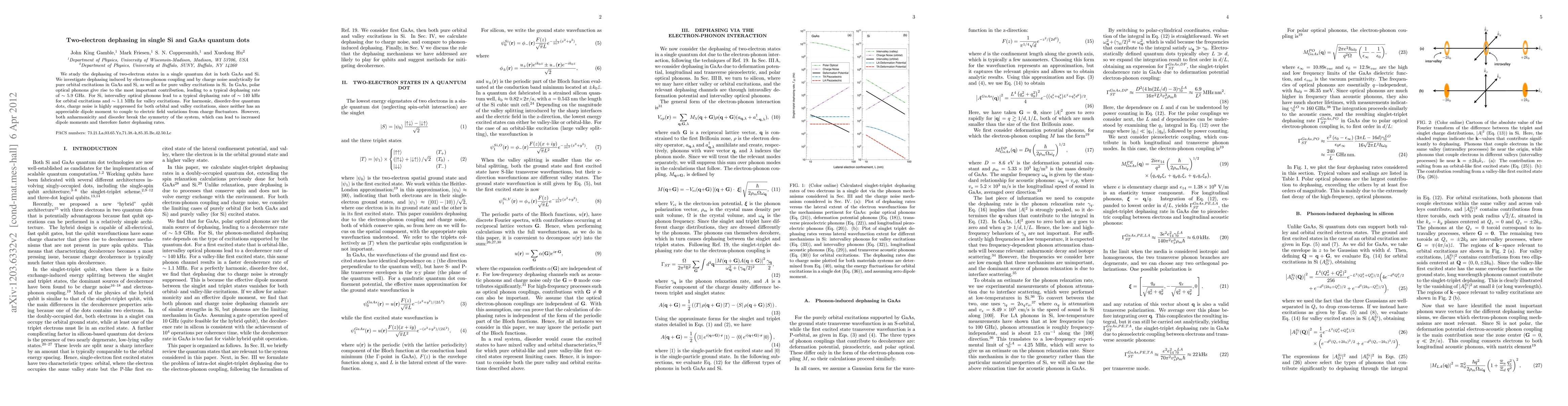 This study investigates the two-electron dephasing mechanisms in single Si and GaAs quantum dots, finding that polar optical phonons in GaAs lead to a dephasing rate of ~5.9 GHz, while intervalley optical phonons in Si cause rates of ~140 kHz for orbital excitations and ~1.1 MHz for valley excitations. Charge noise is minimal in ideal conditions but can increase due to anharmonicity and disorder.