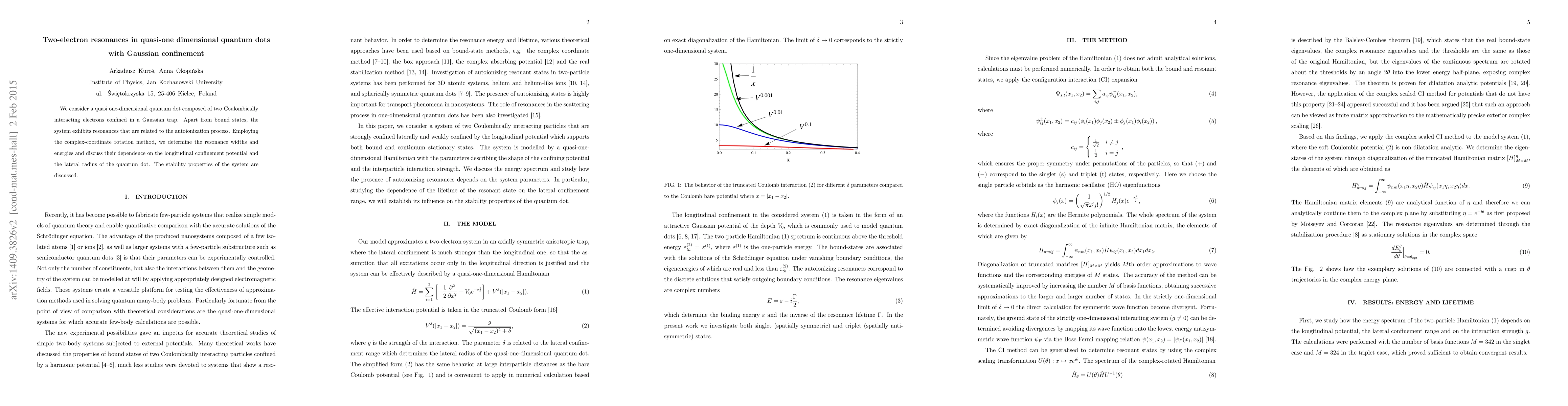 Researchers investigated resonances in a quasi-one-dimensional quantum dot with two interacting electrons confined in a Gaussian trap, finding their widths and energies depend on confinement potential and size.