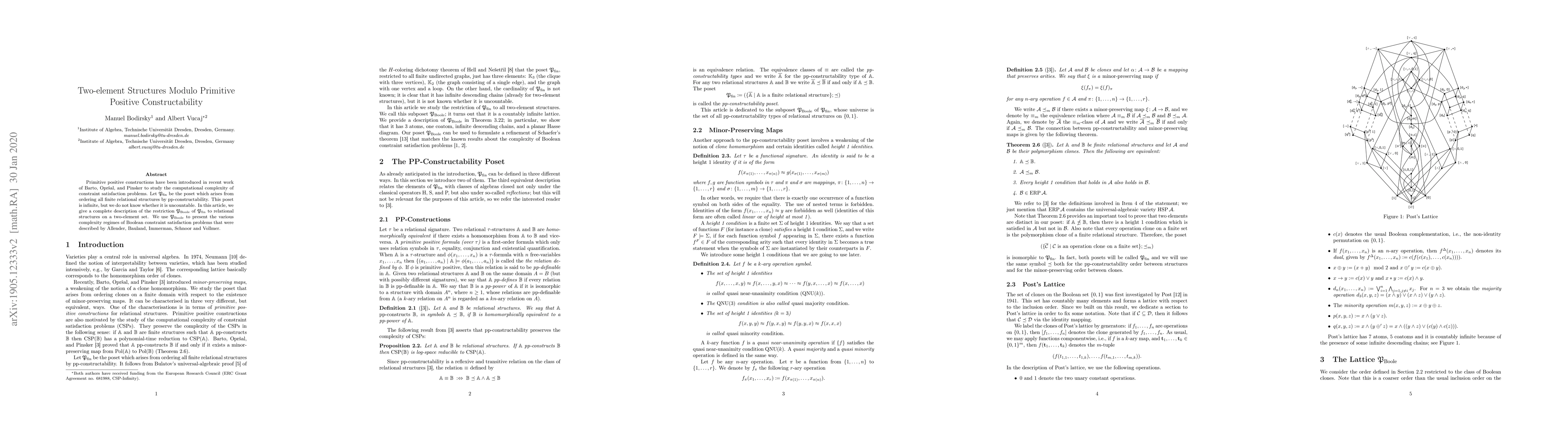 Primitive positive constructions have been introduced in recent work of Barto, Opr\v{s}al, and Pinsker to study the computational complexity of constraint satisfaction problems. Let $\mathfrak P_{\operatorname{fin}}$ be the poset which arises from ordering all finite relational structures by pp-constructability. This poset is infinite, but we do not know whether it is uncountable. In this paper, we give a complete description of the restriction $\mathfrak P_{\operatorname{Boole}}$ of $\mathfrak P_{\operatorname{fin}}$ to relational structures on a two-element set; in particular, we prove that $\mathfrak P_{\operatorname{Boole}}$ is a lattice. Finally, we use $\mathfrak P_{\operatorname{Boole}}$ to present the various complexity regimes of Boolean constraint satisfaction problems that were described by Allender, Bauland, Immerman, Schnoor and Vollmer.