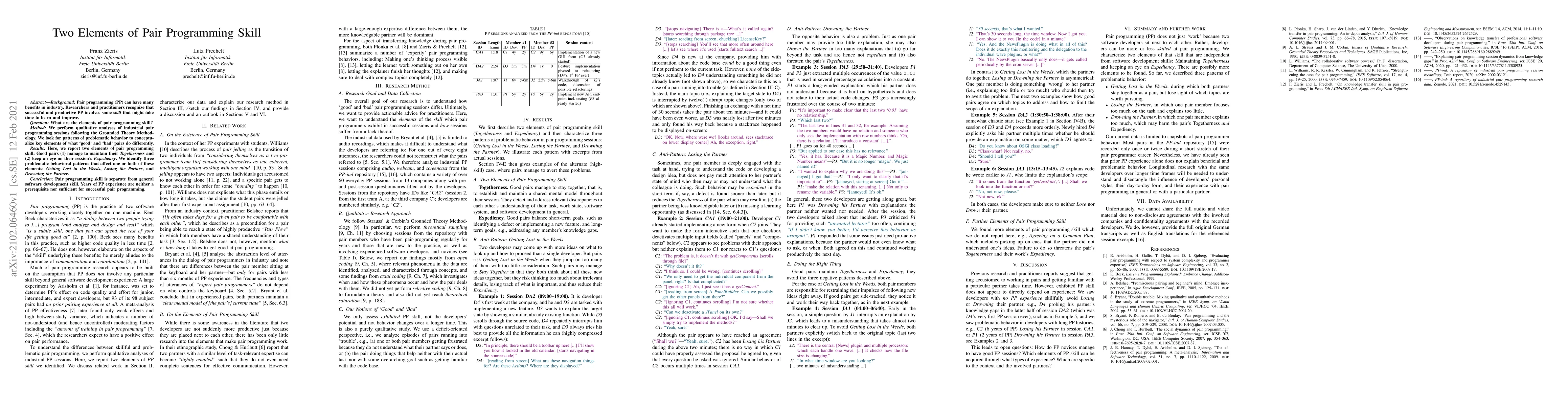 Background: Pair programming (PP) can have many benefits in industry. Researchers and practitioners recognize that successful and productive PP involves some skill that might take time to learn and improve. Question: What are the elements of pair programming skill? Method: We perform qualitative analyses of industrial pair programming sessions following the Grounded Theory Methodology. We look for patterns of problematic behavior to conceptualize key elements of what 'good' and 'bad' pairs do differently. Results: Here, we report two elements of pair programming skill: Good pairs (1) manage to maintain their Togetherness and (2) keep an eye on their session's Expediency. We identify three problematic behavioral patterns that affect one or both of these elements: Getting Lost in the Weeds, Losing the Partner, and Drowning the Partner. Conclusion: Pair programming skill is separate from general software development skill. Years of PP experience are neither a prerequisite nor sufficient for successful pair programming.