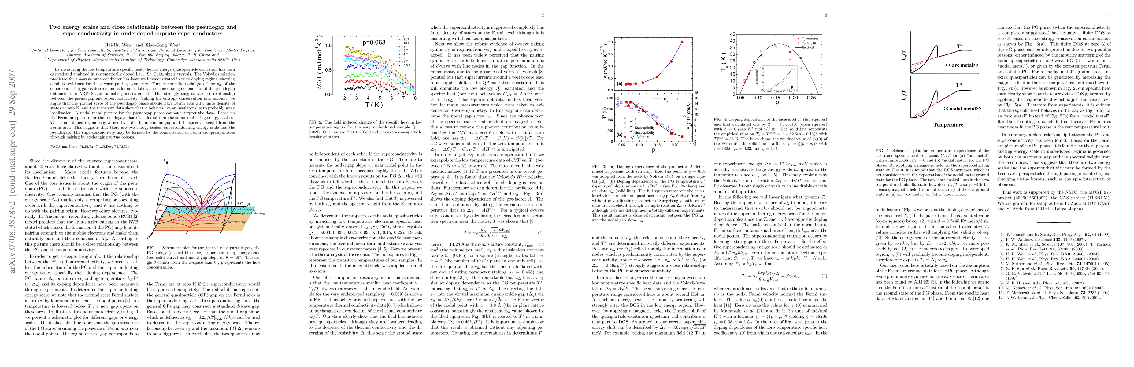 By measuring the low temperature specific heat, the low energy quasi-particle excitation has been derived and analyzed in systematically doped La$_{2-x}$Sr$_{x}$CuO$_{4}$ single crystals. The Volovik's relation predicted for a d-wave superconductor has been well demonstrated in wide doping regime, showing a robust evidence for the d-wave pairing symmetry. Furthermore the nodal gap slope $v_\Delta$ of the superconducting gap is derived and is found to follow the same doping dependence of the pseudogap obtained from ARPES and tunnelling measurement. This strongly suggests a close relationship between the pseudogap and superconductivity. Taking the entropy conservation into account, we argue that the ground state of the pseudogap phase should have Fermi arcs with finite density of states at zero K, and the transport data show that it behaves like an insulator due to probably weak localization. A nodal metal picture for the pseudogap phase cannot interpret the data. Based on the Fermi arc picture for the pseudogap phase it is found that the superconducting energy scale or $T_c$ in underdoped regime is governed by both the maximum gap and the spectral weight from the Fermi arcs. This suggests that there are two energy scales: superconducting energy scale and the pseudogap. The superconductivity may be formed by the condensation of Fermi arc quasiparticles through pairing by exchanging virtue bosons.