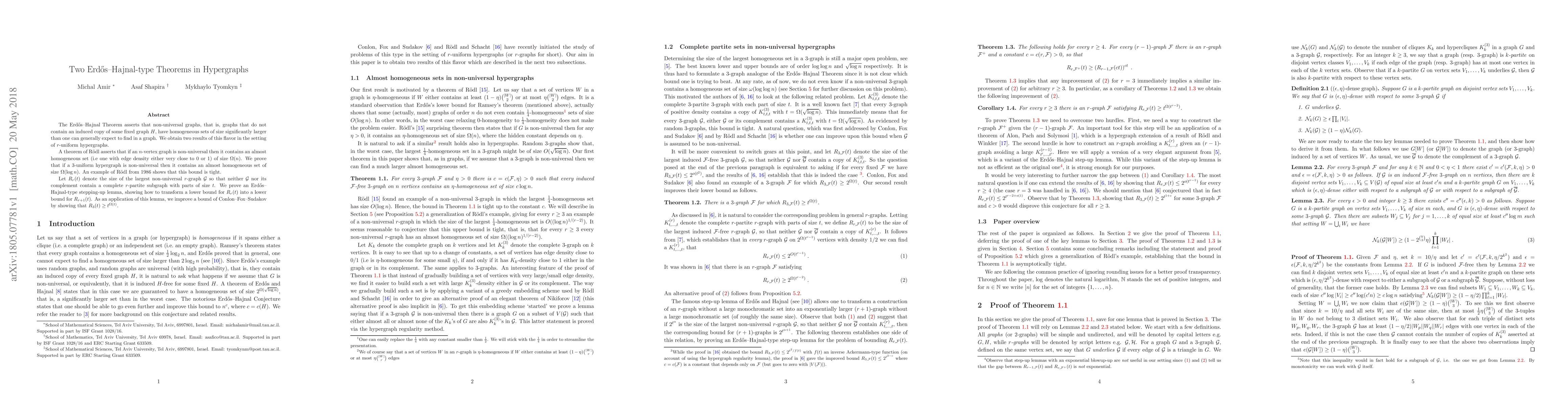 This paper establishes two Erdős-Hajnal-type theorems in the context of $r$-uniform hypergraphs. It proves that non-universal $3$-uniform hypergraphs contain an almost homogeneous set of size $\Omega(\log n)$, and develops a stepping-up lemma to improve bounds on the largest non-universal hypergraphs without certain complete $r$-partite subgraphs, ultimately showing $R_3(t) \geq t^{\Omega(t)}$.