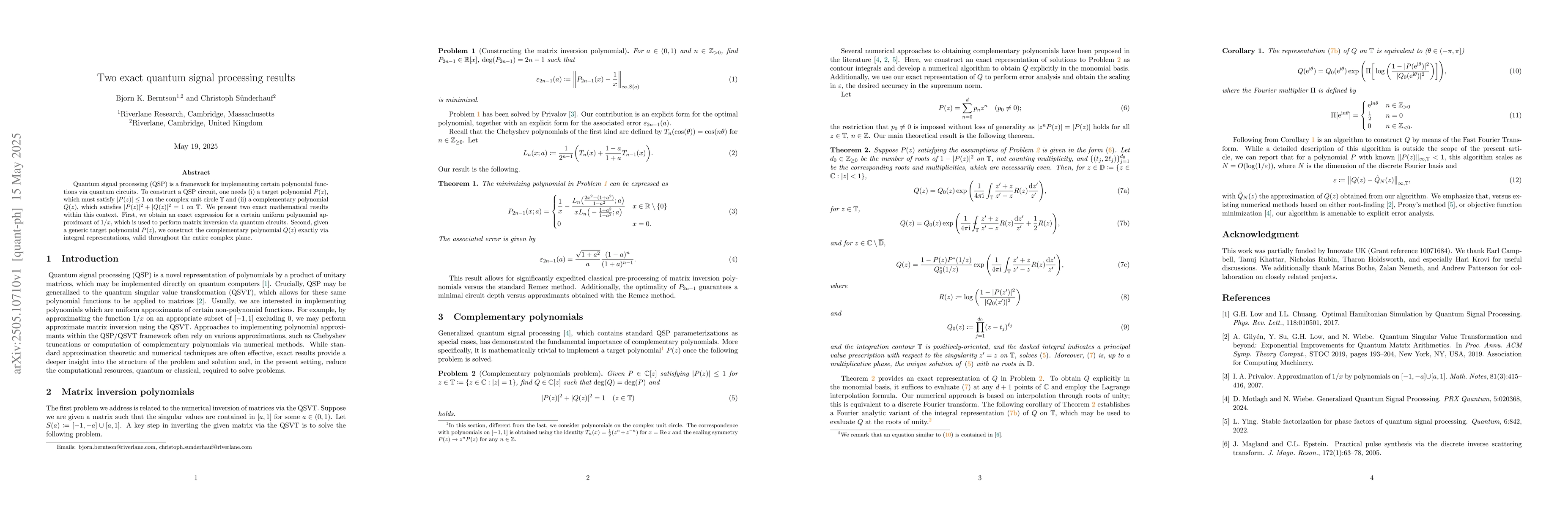 The paper presents exact mathematical results for quantum signal processing (QSP), focusing on constructing QSP circuits using target polynomials P(z) and complementary polynomials Q(z) that satisfy specific conditions on the complex unit circle.