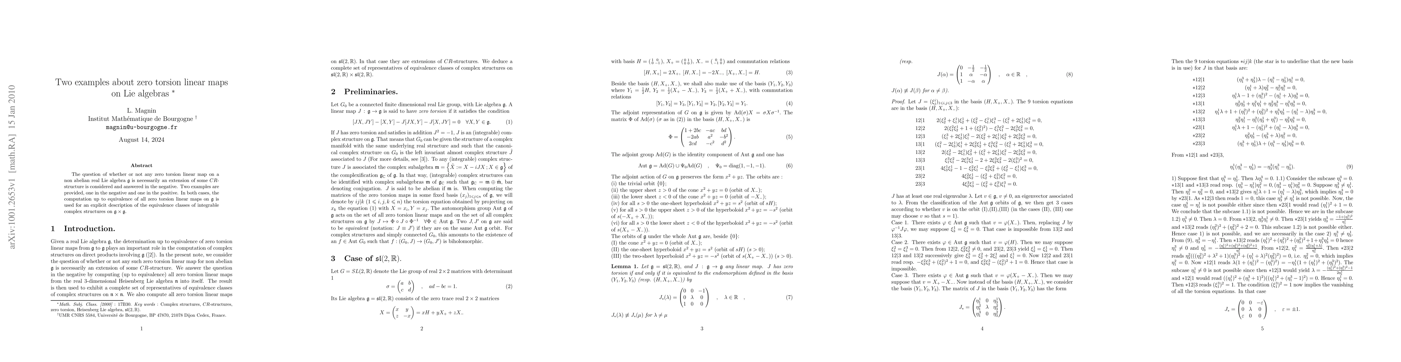 This paper examines zero torsion linear maps on non-abelian real Lie algebras, demonstrating that such maps are not always extensions of CR-structures. It provides two examples, one refuting and one confirming this claim, and uses computations to describe equivalence classes of integrable complex structures on the direct product of the Lie algebra.
