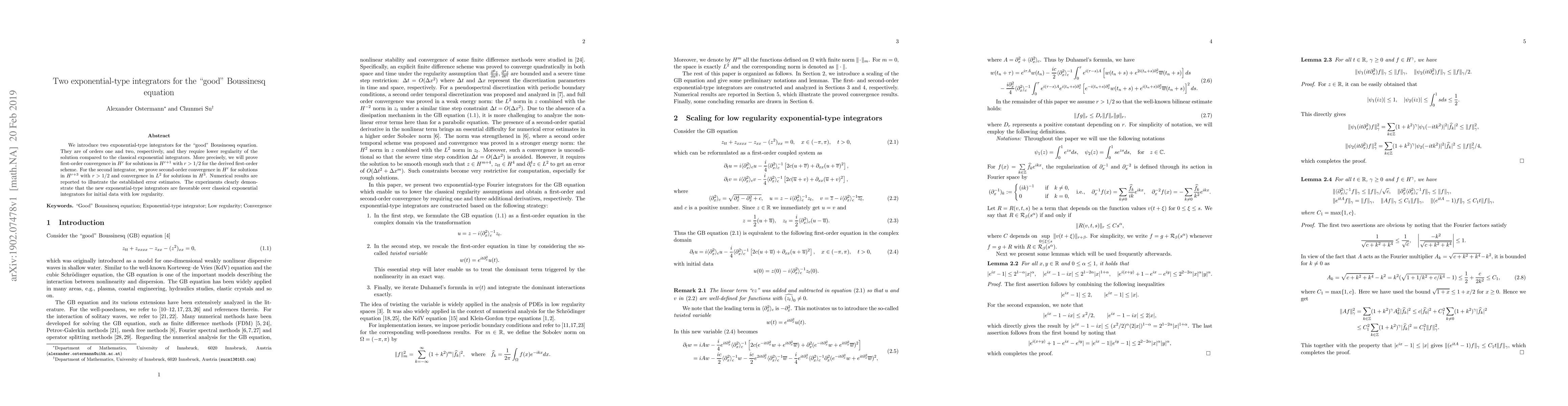 We introduce two exponential-type integrators for the "good" Bousinessq equation. They are of orders one and two, respectively, and they require lower regularity of the solution compared to the classical exponential integrators. More precisely, we will prove first-order convergence in Hrfor solutions in H^{r+1} with r > 1/2 for the derived first-order scheme. For the second integrator, we prove second-order convergence in Hrfor solutions in H^{r+3} with r > 1/2 and convergence in L2for solutions in H^3. Numerical results are reported to illustrate the established error estimates. The experiments clearly demonstrate that the new exponential-type integrators are favorable over classical exponential integrators for initial data with low regularity.