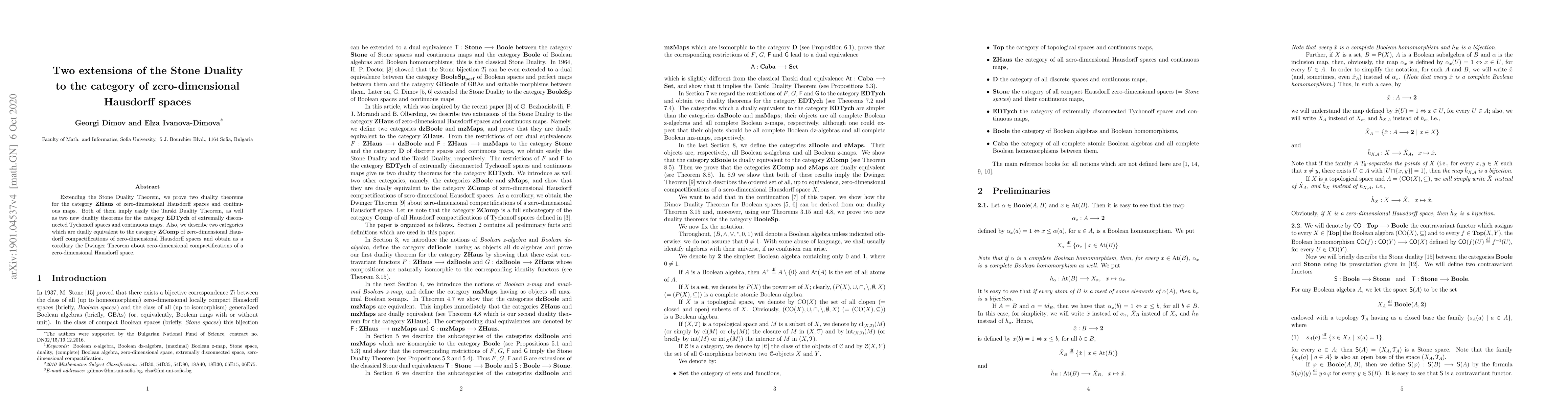 Extending the Stone Duality Theorem, we prove two duality theorems for the category ZHaus of zero-dimensional Hausdorff spaces and continuous maps. Both of them imply easily the Tarski Duality Theorem, as well as two new duality theorems for the category EDTych of extremally disconnected Tychonoff spaces and continuous maps. Also, we describe two categories which are dually equivalent to the category ZComp of zero-dimensional Hausdorff compactifications of zero-dimensional Hausdorff spaces and obtain as a corollary the Dwinger Theorem about zero-dimensional compactifications of a zero-dimensional Hausdorff space.