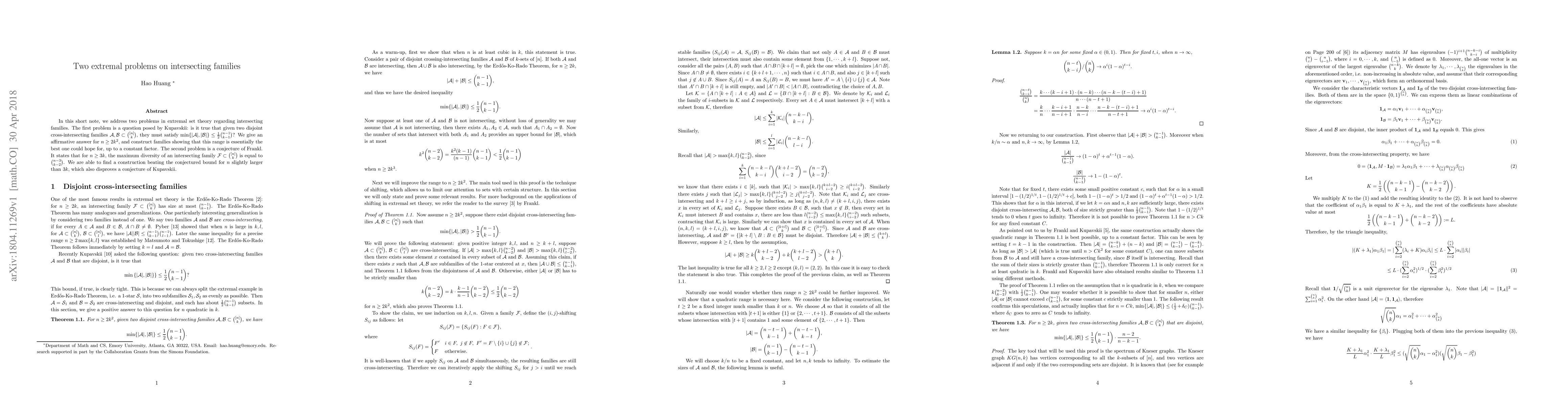 In this short note, we address two problems in extremal set theory regarding intersecting families. The first problem is a question posed by Kupavskii: is it true that given two disjoint cross-intersecting families $\mathcal{A}, \mathcal{B} \subset \binom{[n]}{k}$, they must satisfy $\min\{|\mathcal{A}|, |\mathcal{B}|\} \le \frac{1}{2} \binom{n-1}{k-1}$? We give an affirmative answer for $n \ge 2k^2$, and construct families showing that this range is essentially the best one could hope for, up to a constant factor. The second problem is a conjecture of Frankl. It states that for $n \ge 3k$, the maximum diversity of an intersecting family $\mathcal{F} \subset \binom{[n]}{k}$ is equal to $\binom{n-3}{k-2}$. We are able to find a construction beating the conjectured bound for $n$ slightly larger than $3k$, which also disproves a conjecture of Kupavskii.