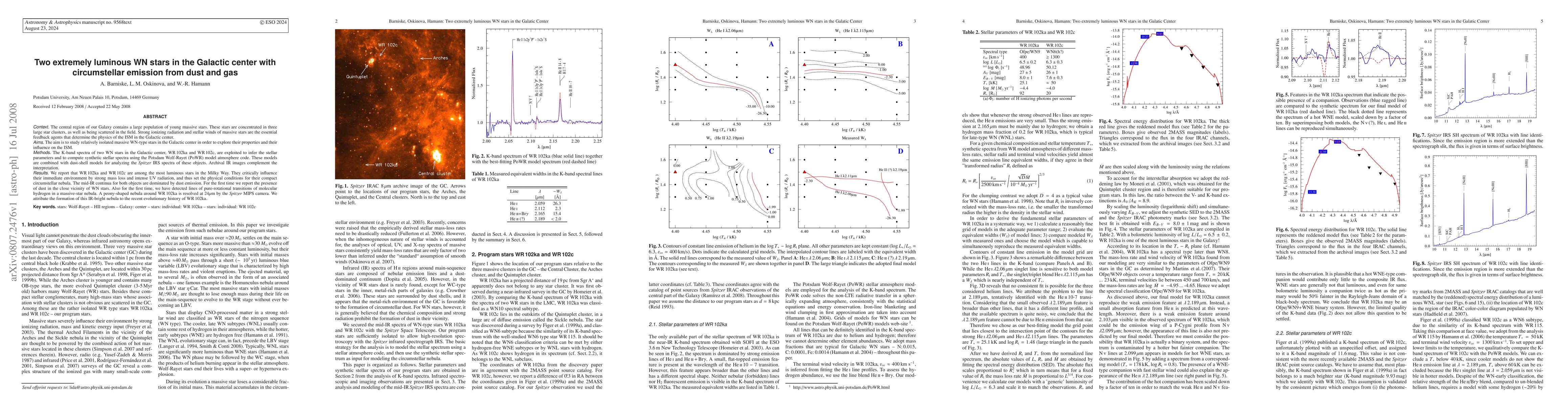We study relatively isolated massive WN-type stars in the Galactic center. The K-band spectra of WR102ka and WR102c are exploited to infer the stellar parameters and to compute synthetic stellar spectra using the Potsdam Wolf-Rayet (PoWR) model atmosphere code. These models are combined with dust-shell models for analyzing the Spitzer IRS spectra of these objects. Archival IR images complement the interpretation. We report that WR102ka and WR102c are among the most luminous stars in the Milky Way. The mid-IR continua for both objects are dominated by dust emission. For the first time we report the presence of dust in the close vicinity of WN stars. Also for the first time, we have detected lines of pure-rotational transitions of molecular hydrogen in a massive-star nebula. A peony-shaped nebula around 102ka is resolved by the Spitzer MIPS camera. We attribute the formation of this nebula to the recent evolutionary history of WR102ka.