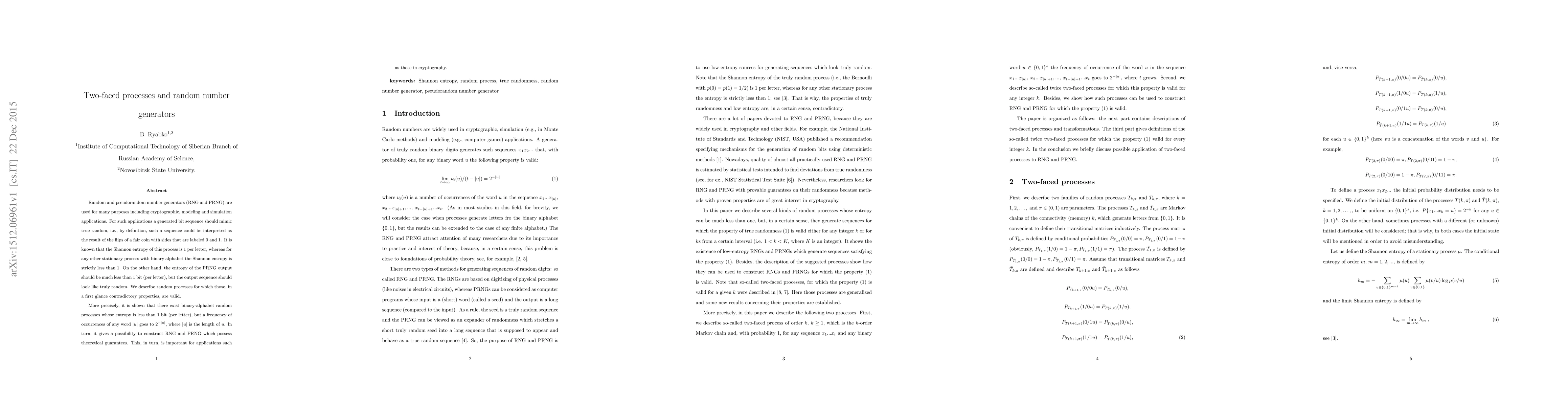 We describe random processes (with binary alphabet) whose entropy is less than 1 (per letter), but they mimic true random process, i.e., by definition, generated sequence can be interpreted as the result of the flips of a fair coin with sides that are labeled 0 and 1. It gives a possibility to construct Random Number Generators which possess theoretical guarantees. This, in turn, is important for applications such as those in cryptography.