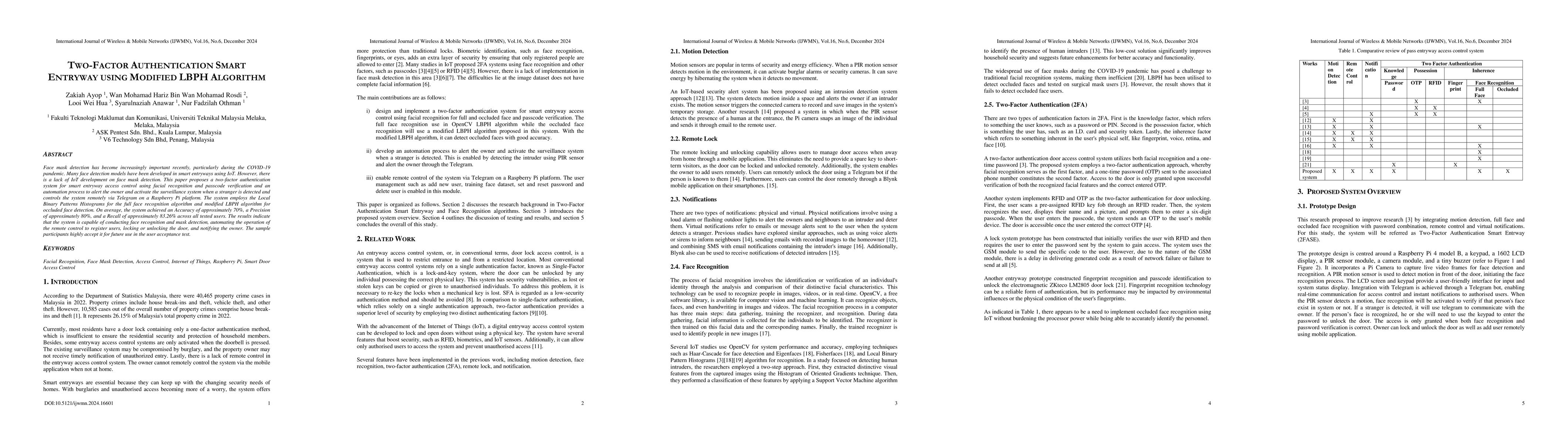 Face mask detection has become increasingly important recently, particularly during the COVID-19 pandemic. Many face detection models have been developed in smart entryways using IoT. However, there is a lack of IoT development on face mask detection. This paper proposes a two-factor authentication system for smart entryway access control using facial recognition and passcode verification and an automation process to alert the owner and activate the surveillance system when a stranger is detected and controls the system remotely via Telegram on a Raspberry Pi platform. The system employs the Local Binary Patterns Histograms for the full face recognition algorithm and modified LBPH algorithm for occluded face detection. On average, the system achieved an Accuracy of approximately 70%, a Precision of approximately 80%, and a Recall of approximately 83.26% across all tested users. The results indicate that the system is capable of conducting face recognition and mask detection, automating the operation of the remote control to register users, locking or unlocking the door, and notifying the owner. The sample participants highly accept it for future use in the user acceptance test.