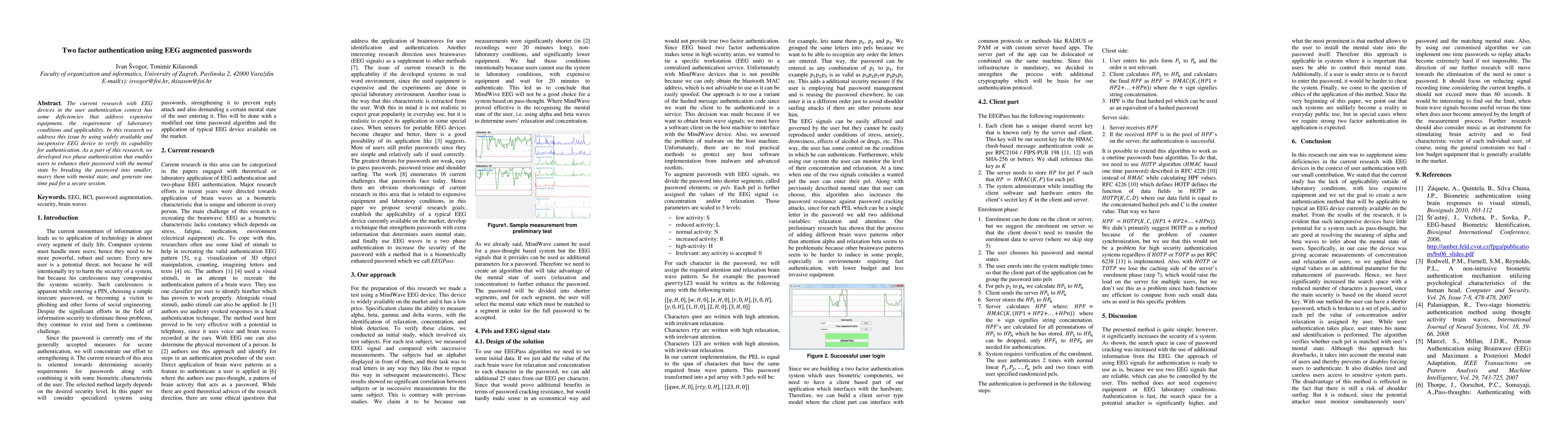 The current research with EEG devices in the user authentication context has some deficiencies that address expensive equipment, the requirement of laboratory conditions and applicability. In this paper we address this issue by using widely available and inexpensive EEG device to verify its capability for authentication. As a part of this research, we developed two phase authentication that enables users to enhance their password with the mental state by breaking the password into smaller, marry them with mental state, and generate one time pad for a secure session.
