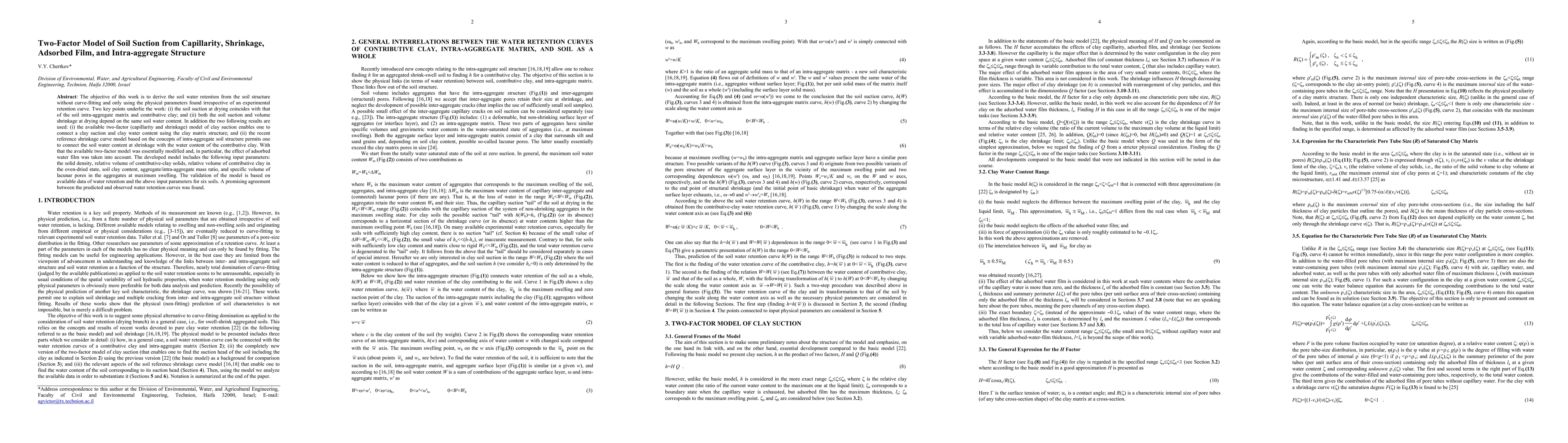 This paper develops a two-factor model to derive soil water retention from soil structure without curve-fitting, incorporating capillarity, shrinkage, adsorbed film, and intra-aggregate structure. The model modifies existing two-factor models by including the effect of adsorbed water film and validates it against data from six soils, showing promising agreement between predicted and observed water retention curves.