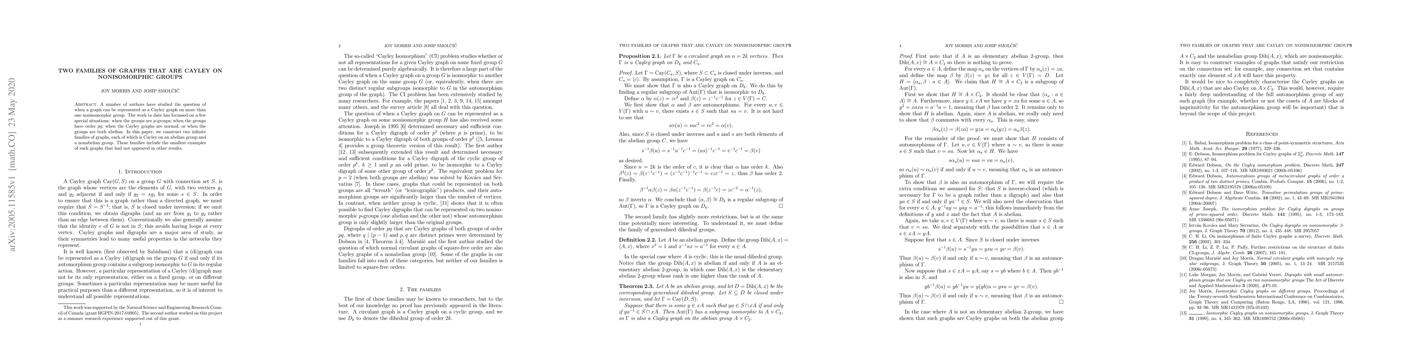 This paper constructs two infinite families of graphs that can be represented as Cayley graphs on both an abelian and a nonabelian group, offering the smallest examples not previously identified in existing research.