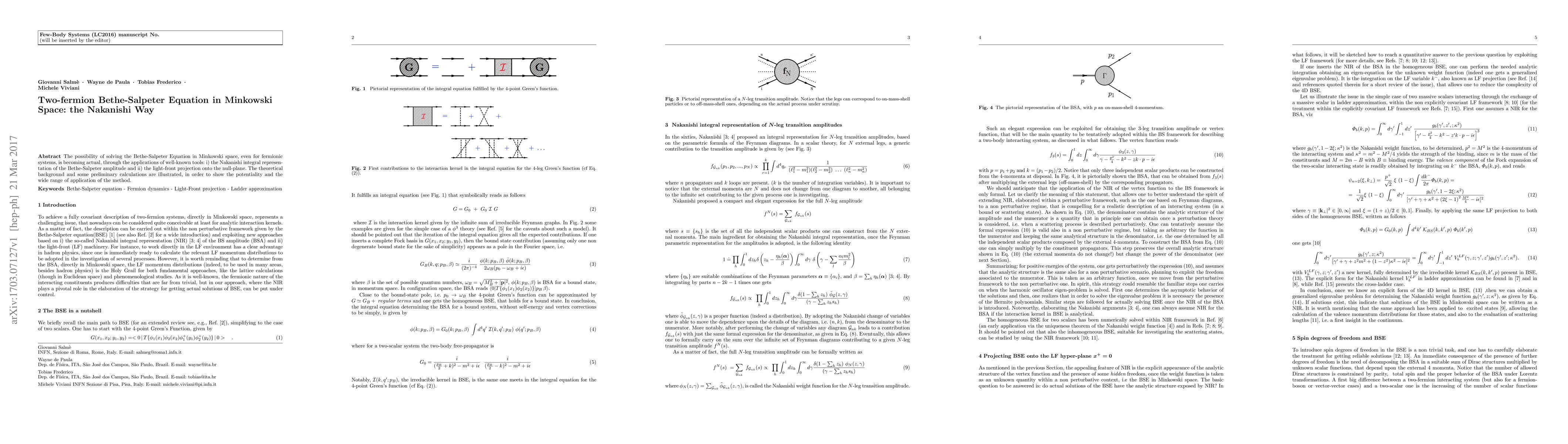 The possibility of solving the Bethe-Salpeter Equation in Minkowski space, even for fermionic systems, is becoming actual, through the applications of well-known tools: i) the Nakanishi integral representation of the Bethe-Salpeter amplitude and ii) the light-front projection onto the null-plane. The theoretical background and some preliminary calculations are illustrated, in order to show the potentiality and the wide range of application of the method.
