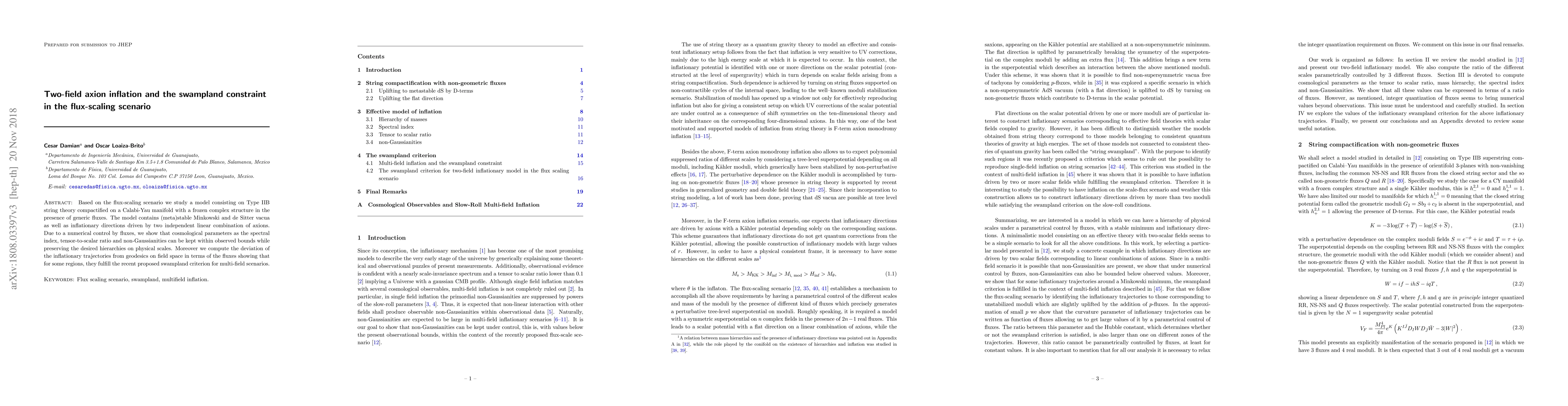 Based on the flux-scaling scenario we study a model consisting on Type IIB string theory compactified on a Calabi-Yau manifold with a frozen complex structure in the presence of generic fluxes. The model contains (meta)stable Minkowski and de Sitter vacua as well as inflationary directions driven by two independent linear combination of axions. Due to a numerical control by fluxes, we show that cosmological parameters as the spectral index, tensor-to-scalar ratio and non-Gaussianities can be kept within observed bounds while preserving the desired hierarchies on physical scales. Moreover we compute the deviation of the inflationary trajectories from geodesics on field space in terms of the fluxes showing that for some regions, they fulfill the recent proposed swampland criterion for multi-field scenarios.