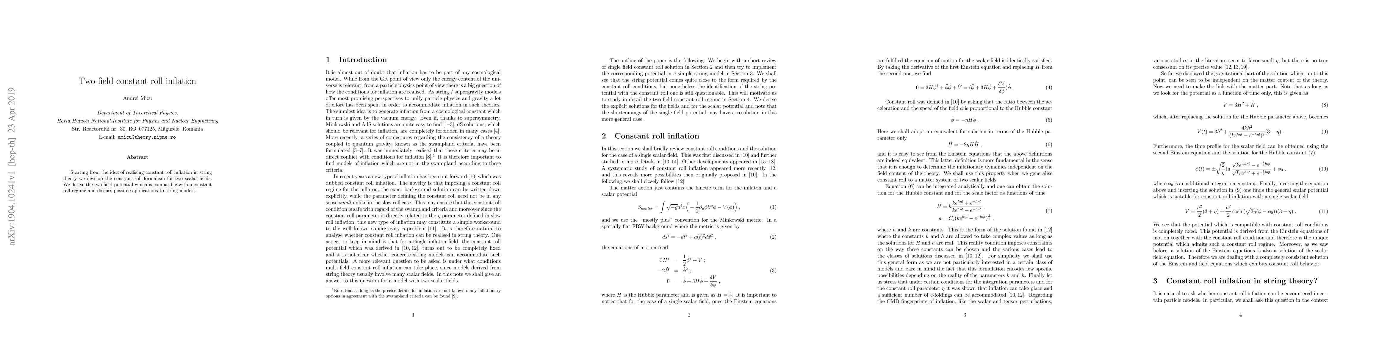 This paper develops a formalism for constant roll inflation using two scalar fields in string theory, deriving a compatible two-field potential and exploring its applications in string-model contexts.